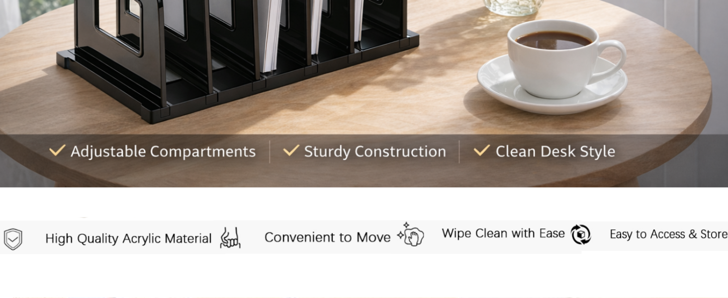【أكريليك متين بلمسة نهائية سوداء حديثة】مصنوع من الأكريليك عالي الجودة، منظم الملفات هذا قوي ومستقر ومصمم للاستخدام اليومي. تخلق الحواف الناعمة واللمسة النهائية السوداء الأنيقة مظهرًا عصريًا ونظيفًا يناسب بشكل جيد المكاتب الاحترافية أو إعدادات المنزل البسيطة أو مساحات العمل المشتركة.