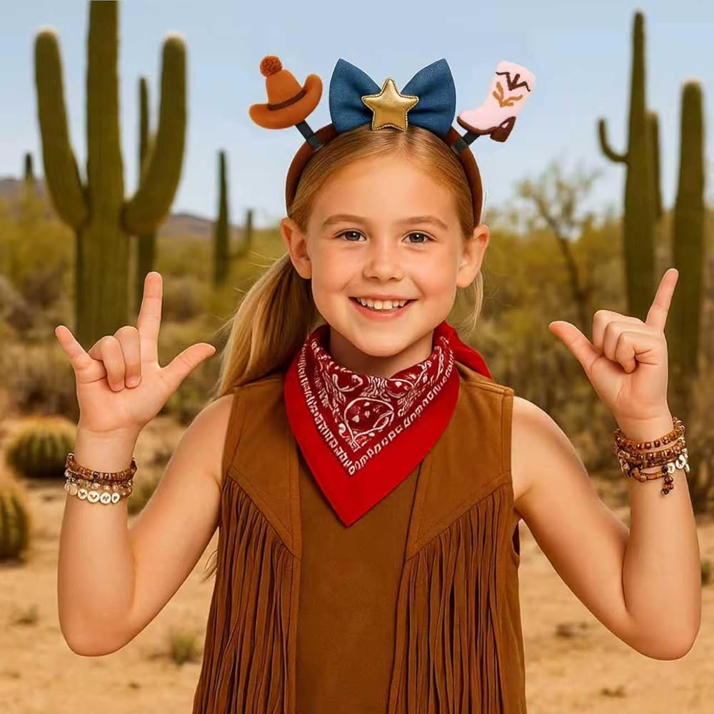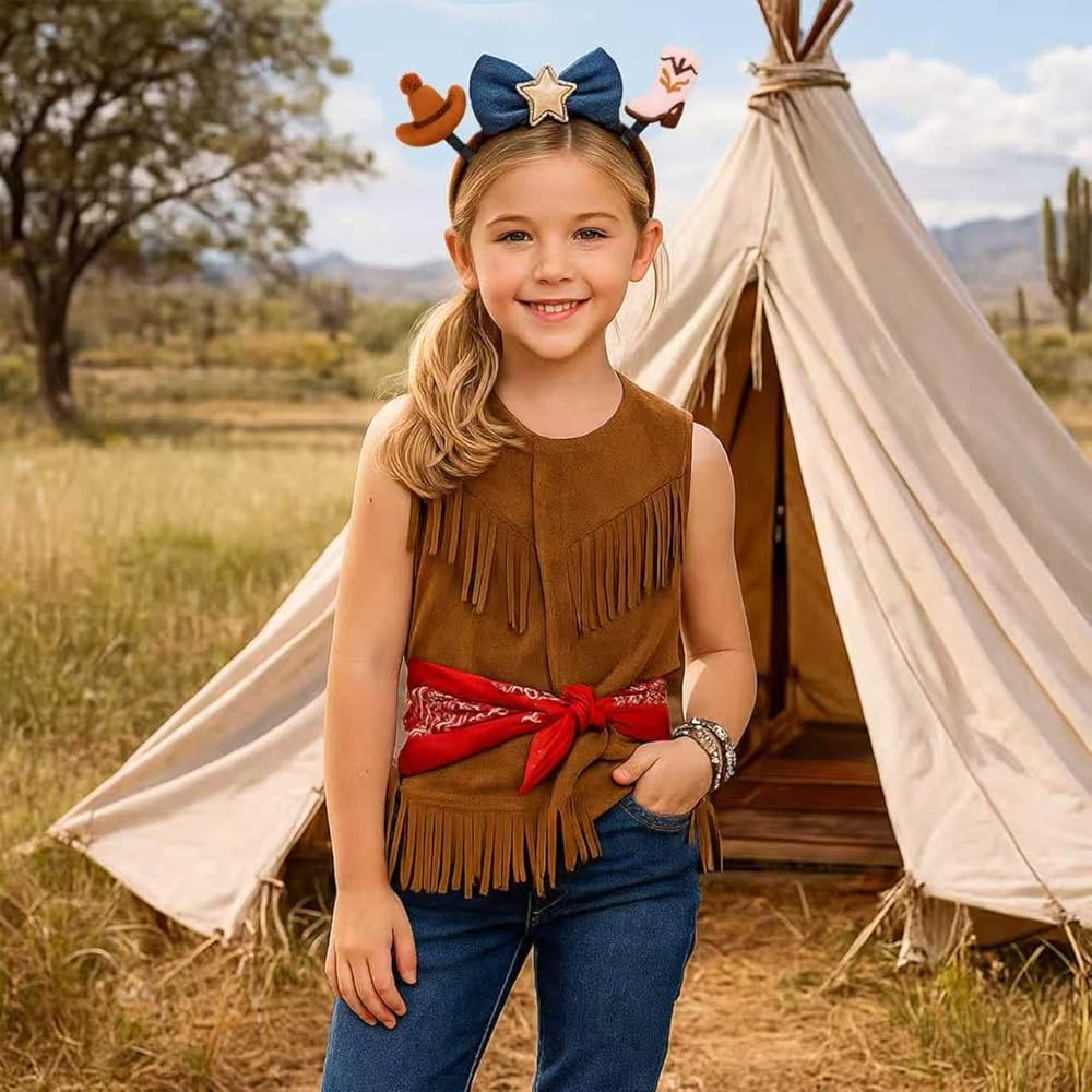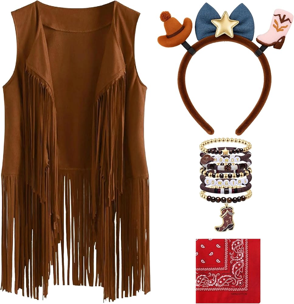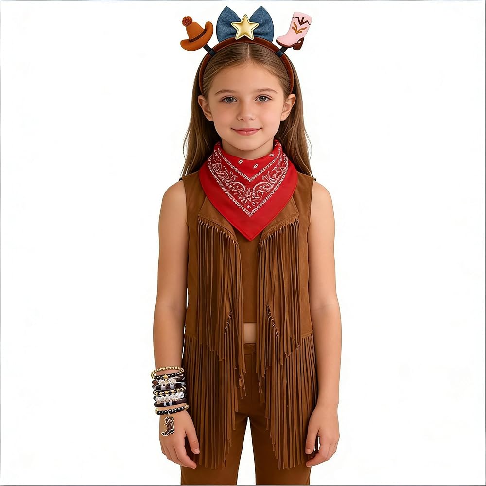 • مجموعة ملابس راعية البقر الغربية: 4 قطع ملابس للفتيات - سترة مهدبة، وعصابة رأس رعاة البقر، وأساور مطرزة، ومنديل أحمر.