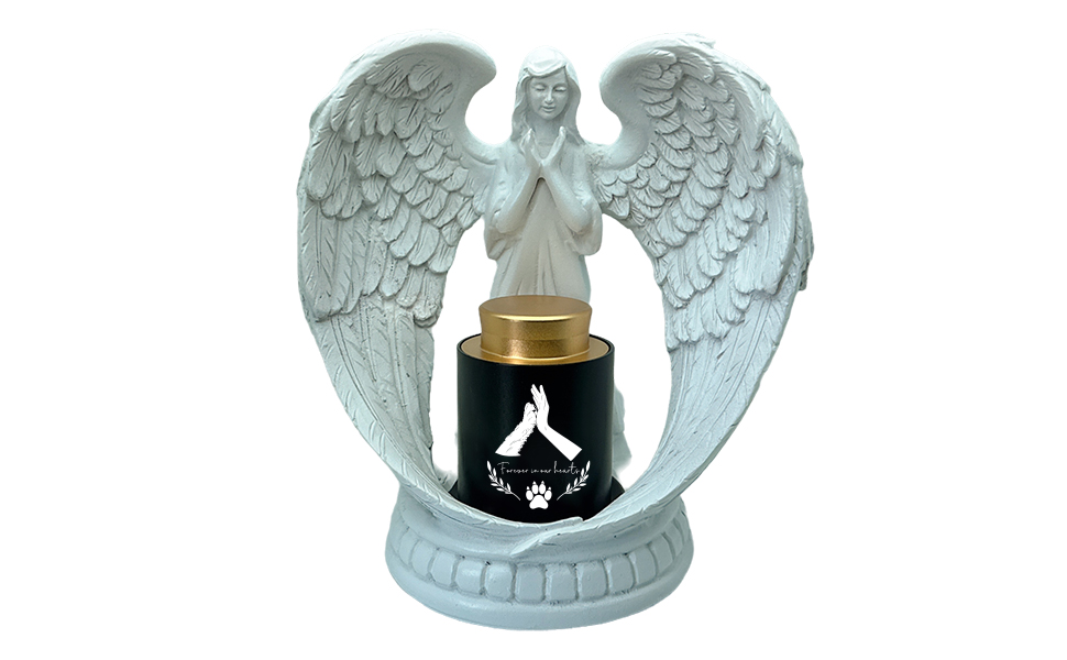 【قاعدة الملاك الحارس】محتضنة بتمثال ملاك الصلاة الهادئ مع أجنحة ريش مفصلة، تصبح هذه الجرة تحية روحية لولي أمرك وصديقك المفضل. يقدم الملاك حضورًا ساهرًا، يرمز إلى السلام الأبدي والحماية لكلبك العزيز.