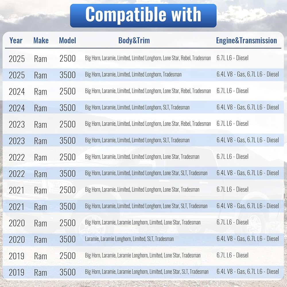 ✅【تركيب مثالي】: متوافق مع دودج رام 2500 6.7L L6 2019-2025، متوافق مع دودج رام 3500 6.4L V8 - غاز، 6.7L L6 2019-2025 (⚠️⚠️⚠️ملاحظة: للحصول على قائمة مفصلة بالمركبات المتوافقة، يرجى الرجوع إلى الصورة المقدمة، إذا كانت لديك أي شكوك، يرجى الرجوع إلينا مباشرة.