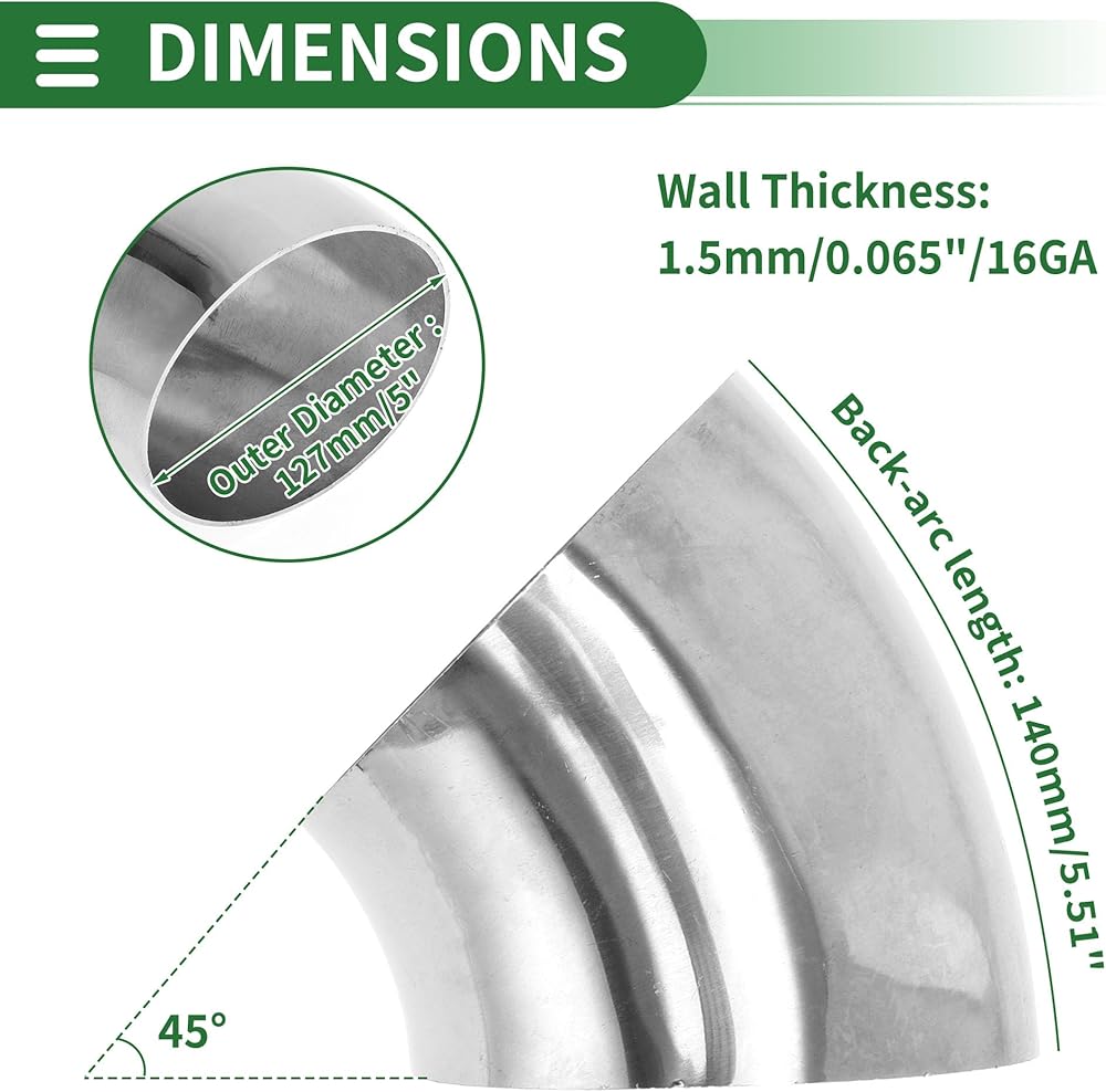 • Feature:Pipe Type: 45 Degree Bend Elbow; Outer Diameter: 127mm/5"; Back-arc length: 140mm/5.51"; Wall Thickness: 1.5mm/0.065"/16GA