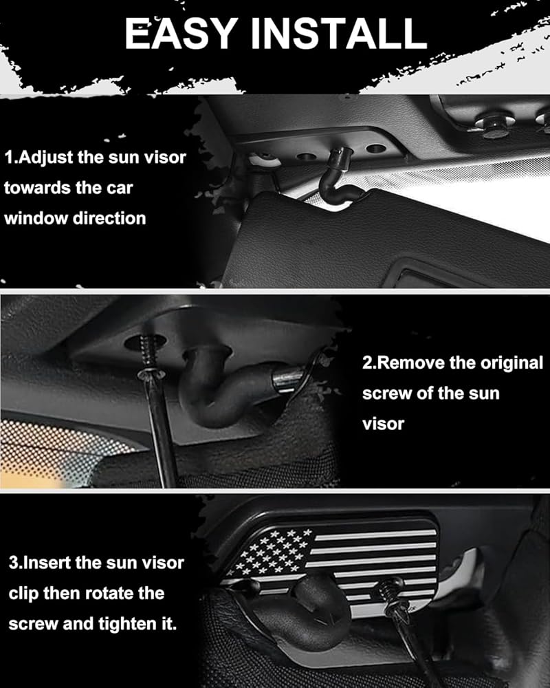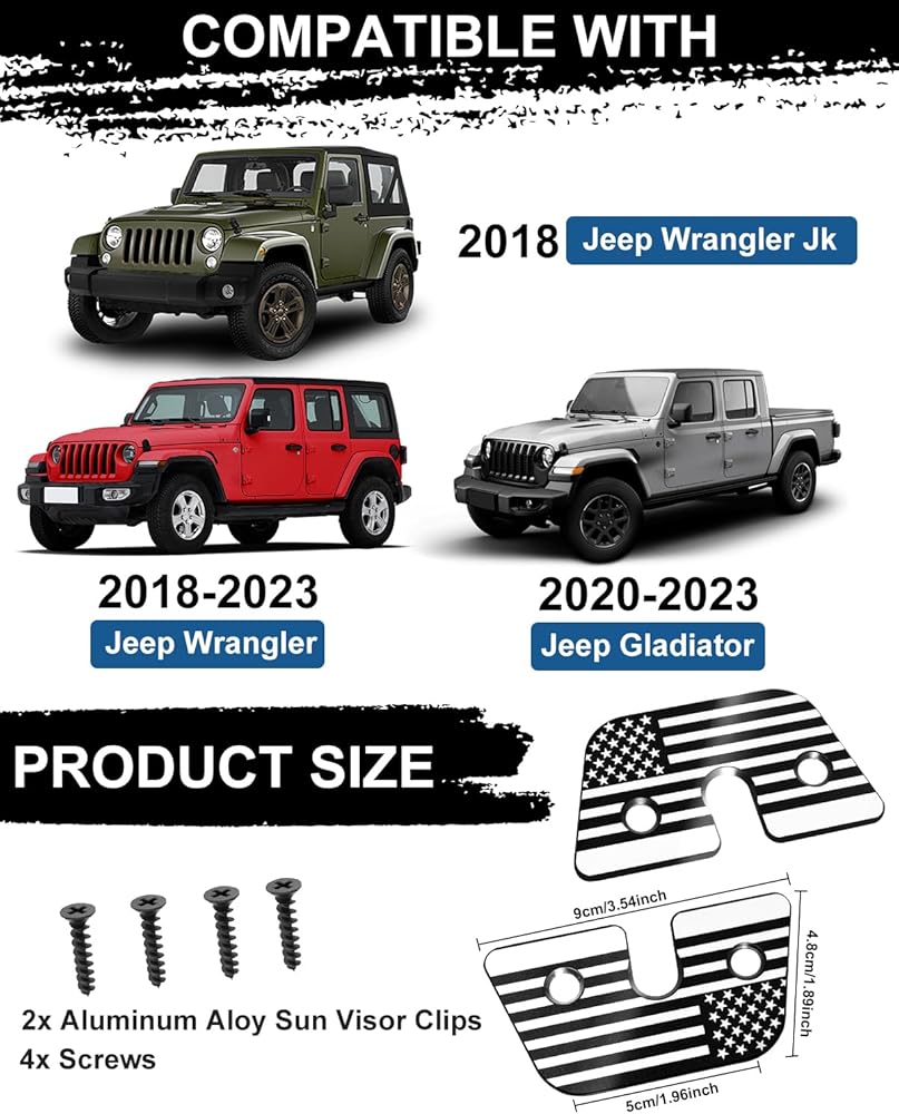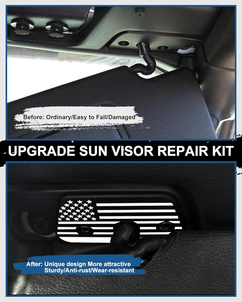 متوافق مع: مجموعة إصلاح واقي الشمس لسيارة جيب رانجلر مصممة لتناسب موديلات جيب رانجلر JK (2018)، JL (2018-2023)، وجلاديتور (2020-2023). تعتبر مجموعة إصلاح حاجب الشمس هذه مثالية لاستعادة حاجب الشمس الخاص بك. يرجى التحقق من التوافق قبل الشراء، لأنه غير مناسب لموديلات 2024. تتضمن العبوة 2 مشبك واقي من الشمس، و4 براغي، ومفك براغي صغير ودليل المستخدم.