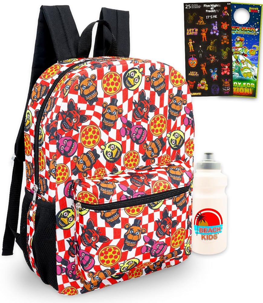 Officially licensed Five Nights at Freddy's backpack for kids custom product bundle also includes a Beach Kids water bottle, Five Nights at Freddy's stickers, and a Rex-Man door hanger. WARNING: CHOKING HAZARD—Small parts. Not for children under 3 yrs.