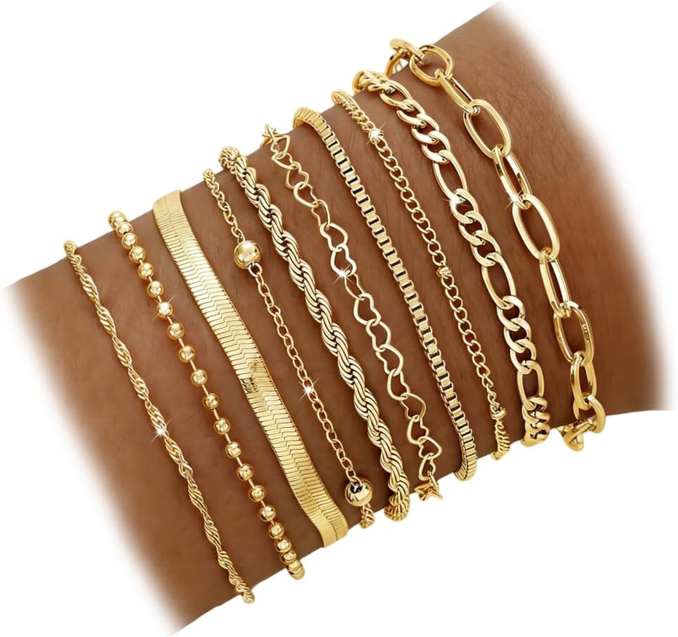 أساور ذهبية أنيقة للنساء: يمكن تكديس 10 أساور ذهبية عصرية. يمكن ارتداء كل سوار من السلسلة الذهبية بشكل فردي أو مع أساور أخرى متعددة الطبقات لخلق أسلوبك الخاص.
