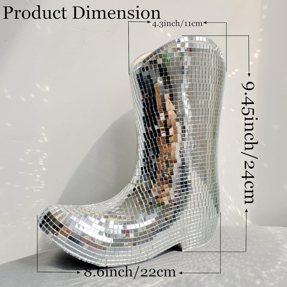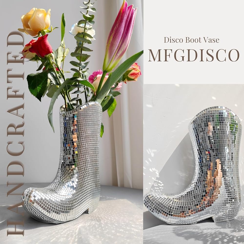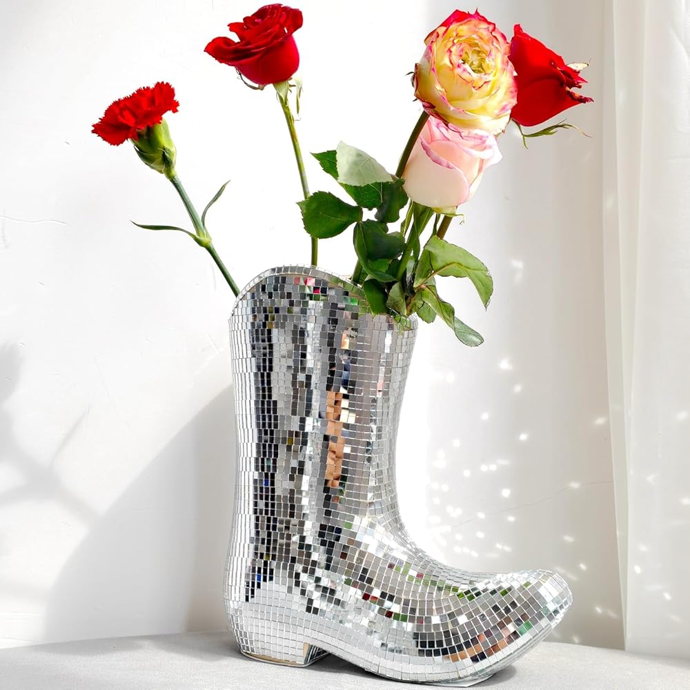 مزيج آسر من الأنماط: تمزج مزهرية كرة الديسكو الفريدة هذه ببراعة سحر الغرب البري الريفي مع بريق الديسكو المبهر في السبعينيات. إنها بداية محادثة حقيقية تضيف لمسة جريئة وغير متوقعة إلى ديكور منزلك أو الفناء أو صالون التجميل