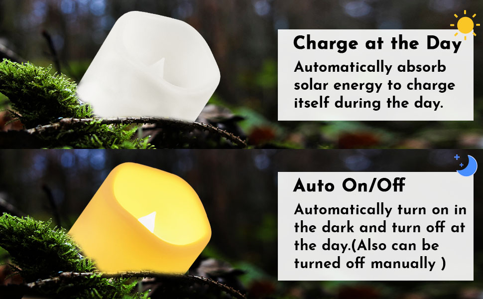 ☀️تعمل بالطاقة الشمسية - تحتوي هذه الشمعة الشمسية المطورة على ألواح شمسية مدمجة وتتميز بتصميم مخفي لا يؤثر على سلامة وجمال مظهرها على الإطلاق. الشموع عديمة اللهب توفر لك دفء الشمس باستمرار في الليل