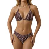 This chic polka dot bikini set brings timeless retro style to your swimwear collection. The two-piece design features a classic triangle halter top with adjustable ties at the neck and back, allowing you to customize the fit for maximum comfort and support. The playful black and white polka dot pattern creates a vintage-inspired look that never goes out of style, while the contrasting white lining adds a fresh, modern touch. The mid-rise cheeky bottom offers moderate coverage with a flattering cut that accentuates your curves and elongates your legs. Perfect for lounging poolside, beach vacations, or tropical getaways, this versatile swimsuit transitions effortlessly from sunbathing to beach volleyball. The halter neckline provides excellent support while creating an elegant silhouette, and the adjustable straps ensure a secure, personalized fit. Whether you're sipping cocktails by the pool or catching waves at the shore, this polka dot bikini set combines comfort, style, and confidence in one stunning package.