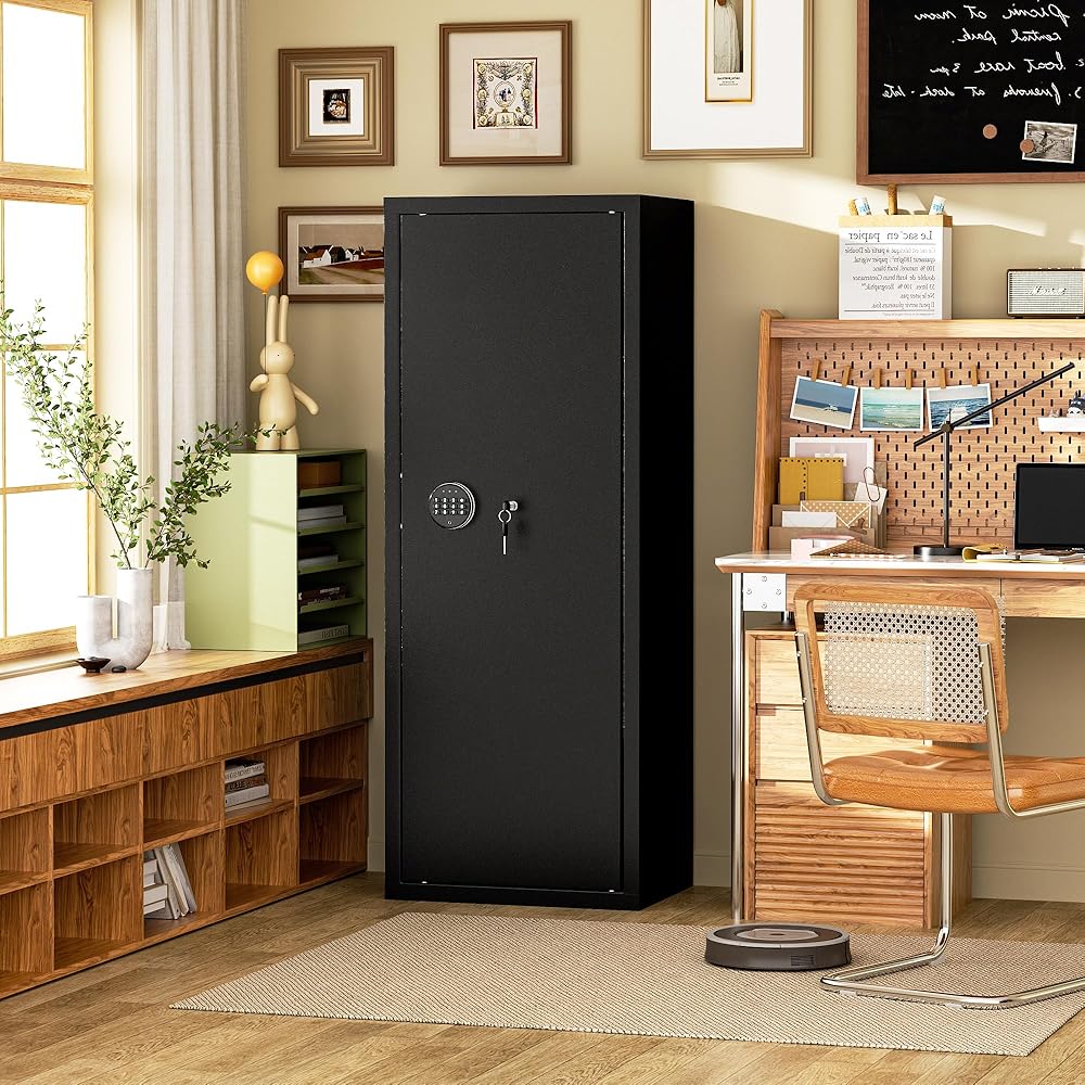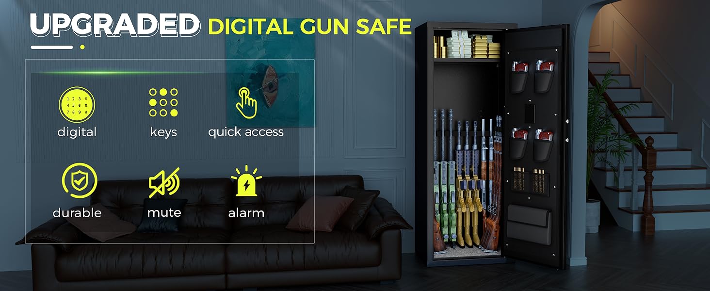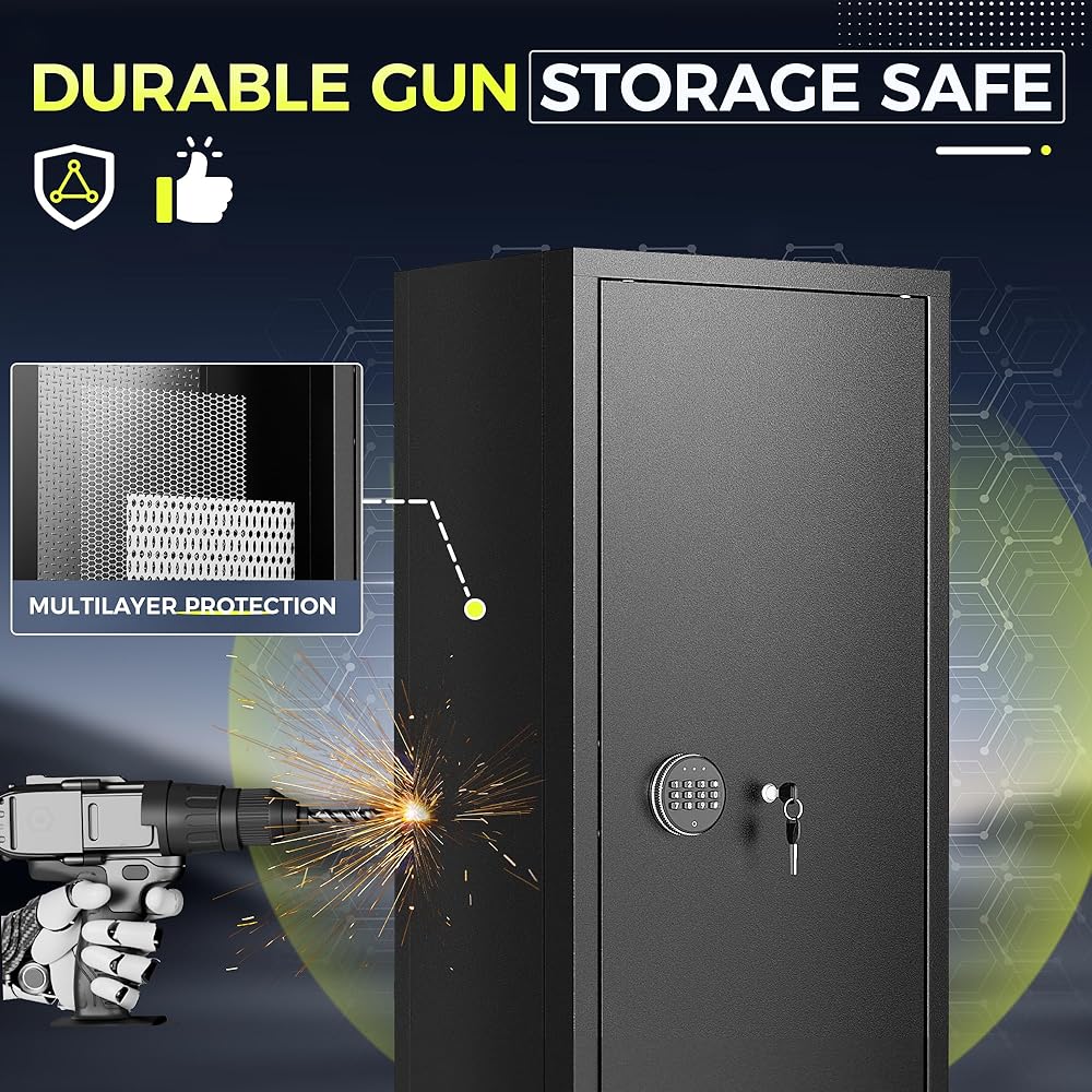 ✅【آمنة للبندقية بنظام إسكات وقفل】: تحتوي خزانة البندقية على نظام صامت وقفل، اضغط لفترة طويلة على علامة "*"، يمكنك الدخول إلى الوضع الصامت، حتى تتمكن من الحصول على بيئة استخدام هادئة؛ خطأ في إدخال كلمة المرور 5 مرات، سيتم قفل خزانة البندقية، مما سيحمي خزانة بندقيتك بشكل فعال.
