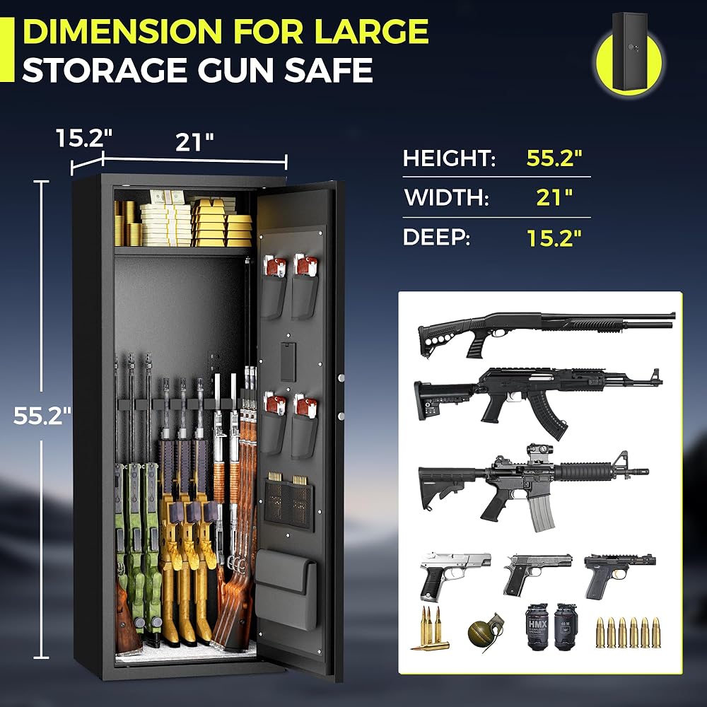 ✅【مساحة تخزين فائقة للمسدس】: حجم خزانة الأسلحة: الارتفاع 55.2 بوصة × العرض 21 بوصة × العمق 15.2 بوصة، بالمقارنة مع المنتجات المماثلة، فهي تحتوي على مساحة تخزين أعمق وأوسع، وتحتوي على طبقتين من مساحة التخزين. إذا شعرت أن ارتفاع الطبقة السفلية ليس كافيًا، فيمكنك إزالة القسم الأوسط للوصول إلى الارتفاع المقابل لبندقيتك. حتى تتمكن من الاستفادة الكاملة من مساحة التخزين.