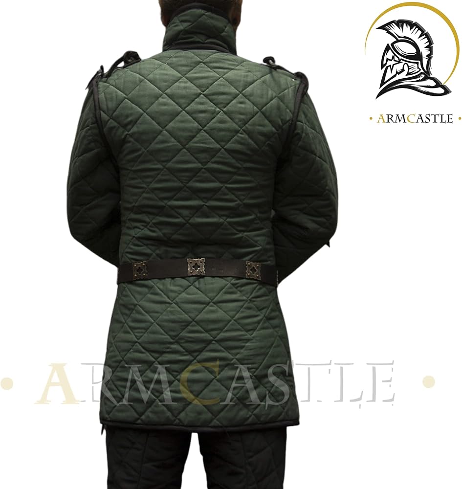 • 🔰PREMIUM QUALITY ARMOR GAMBESON: A gambeson is a cushioned protective garment that can be worn alone or under mail or plate armour. The Gambeson Coat is made of high-quality cotton fibres and has a lot of movement. For additional comfort, breathability, and durability, raw cotton pads and cotton linen are used.