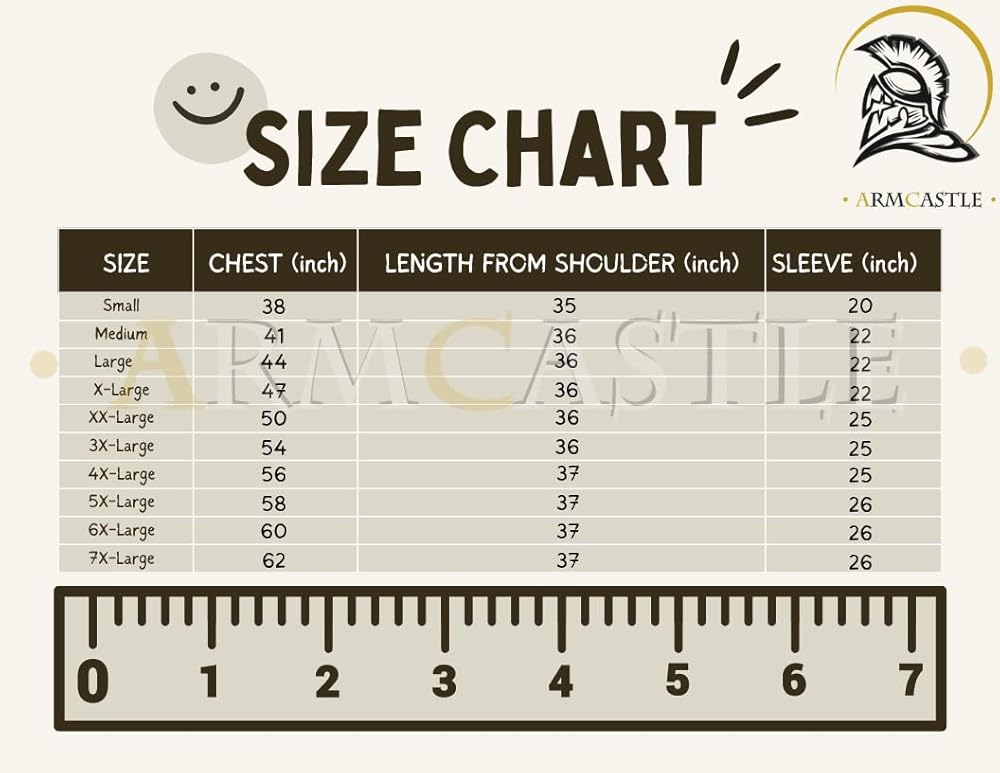 7X-Large Size:- (Chest Diameter: 62", Length From Shoulders: 37", Sleeves: 26")
