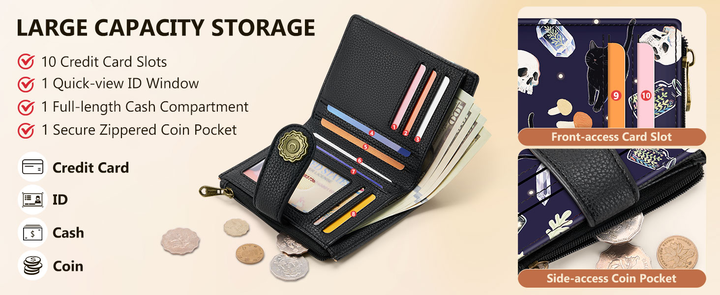 سعة كبيرة: تحتوي على 10 فتحات للبطاقات، و1 نافذة شفافة لبطاقة الهوية، و1 جيب كامل للفواتير، وجيب واحد للعملات المعدنية بسحاب - الكثير من التخزين بدون حجم كبير! لا مزيد من البطاقات الفوضوية وغير المنظمة أو العملات المعدنية المفقودة؛ فهو يحافظ بسهولة على بطاقات الائتمان والهوية والنقود والضروريات اليومية بشكل أنيق أينما ذهبت