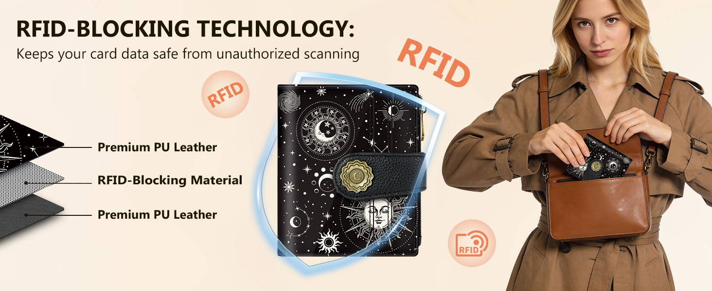 حجب RFID: تتميز محفظة RFID للسيدات بتقنية حجب RFID المتقدمة لإيقاف النشل الإلكتروني بشكل أفضل. فهو يحظر بشكل آمن عمليات الفحص غير المصرح بها، لذلك تظل معلومات بطاقة الائتمان والبيانات الشخصية أكثر خصوصية. إنه أكثر من مجرد ملحق خفيف الوزن، فهو بمثابة حارس موثوق للأموال - فلا داعي للقلق بشأن سرقة البيانات بعد الآن