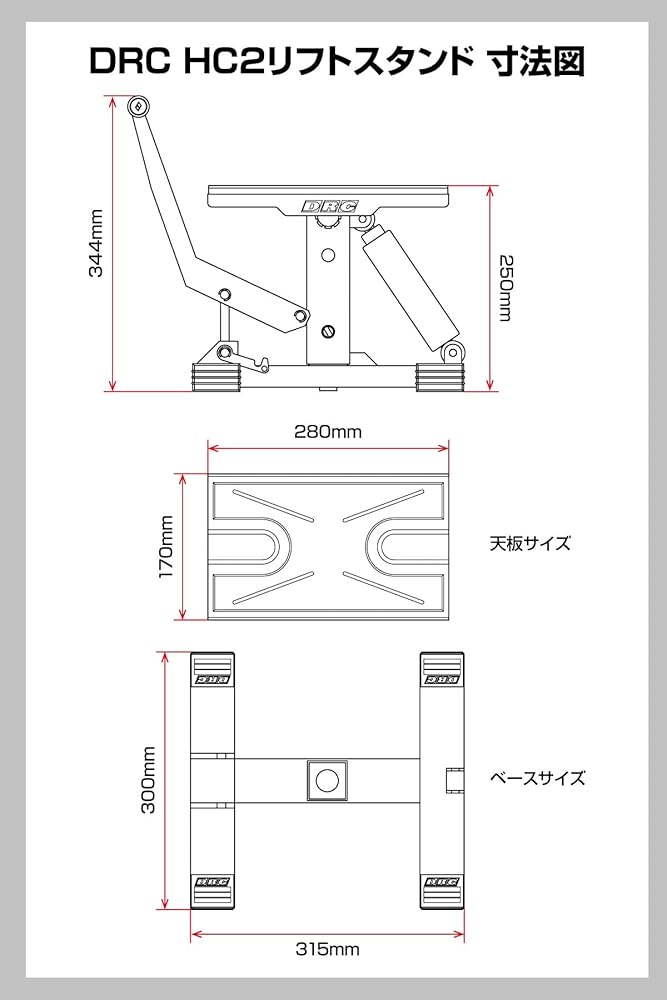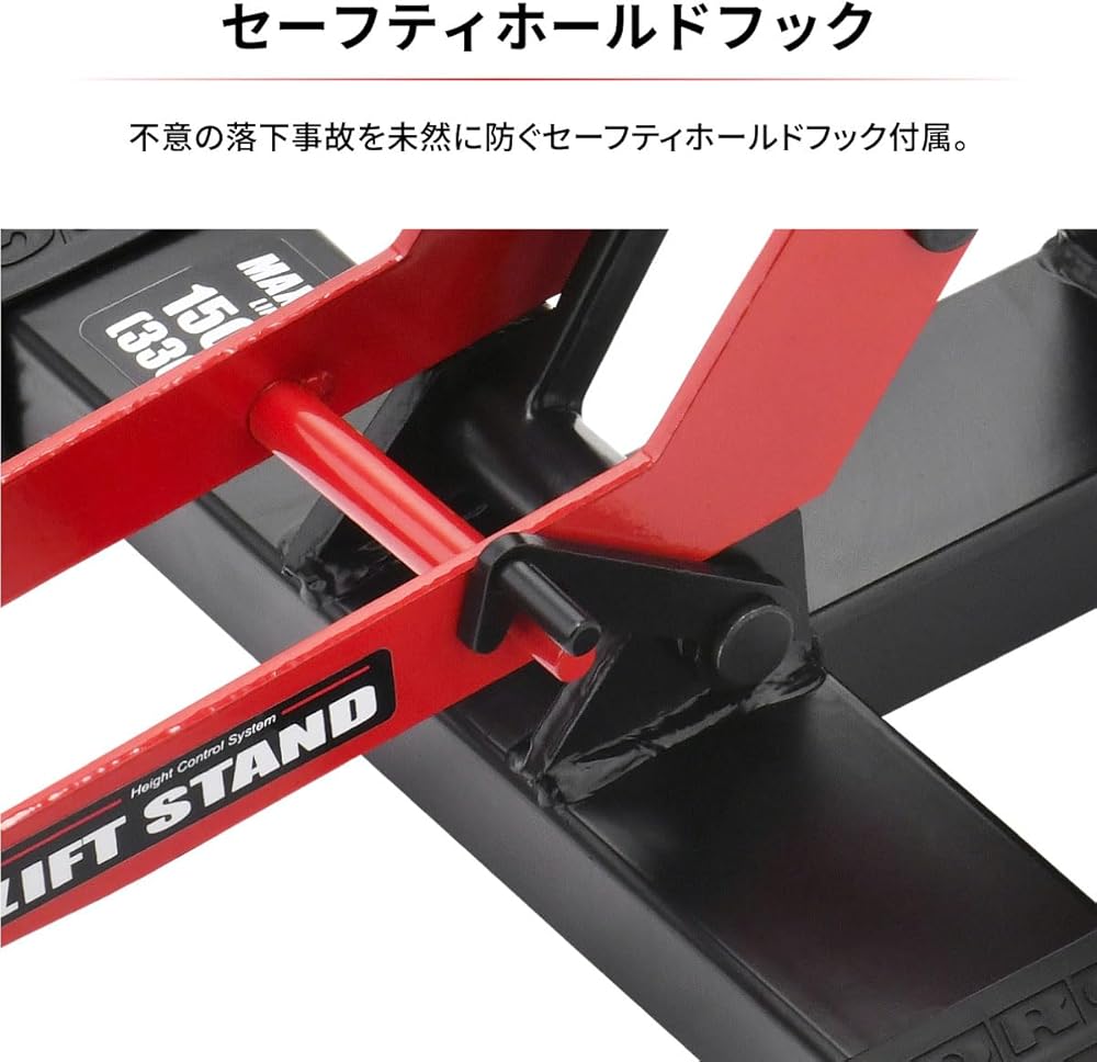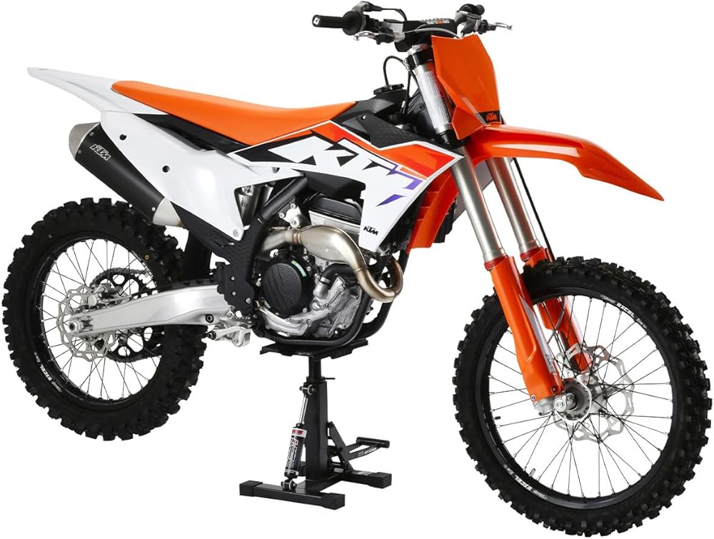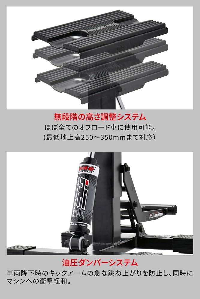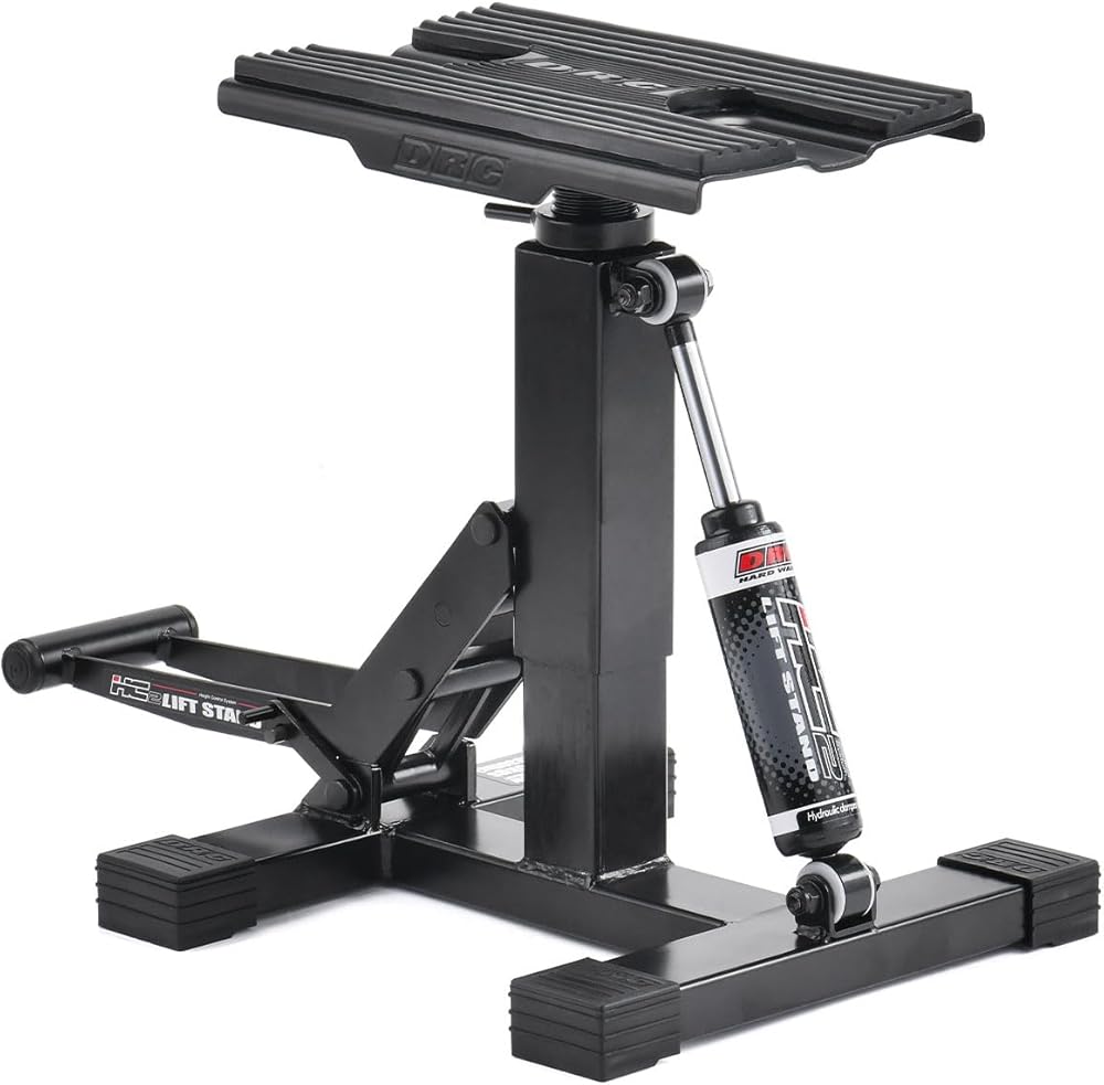 Height adjustable lift stand for dirt bikes. Designed for small to full size dirt bikes. Damper shock eliminates the sudden drop, and provides a smooth, safe landing. Top plate is height-sdjustable (10-14in.) to fit under most dirt bikes. Easily operated durable double long-levered jack-pedal. Maximum lifting weight is 330 lbs (150 kgs).