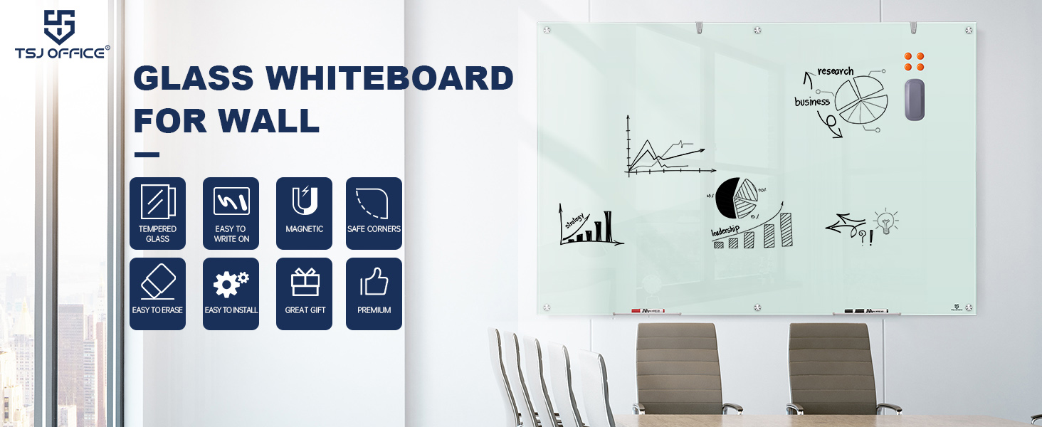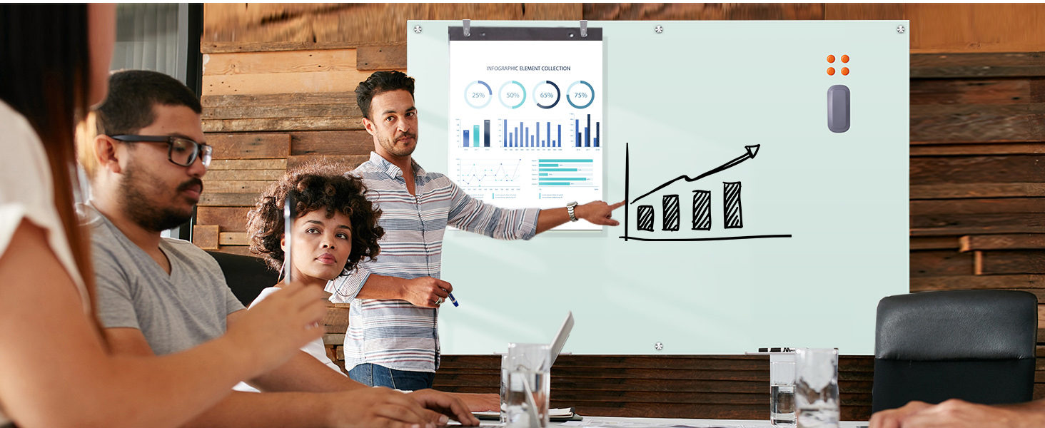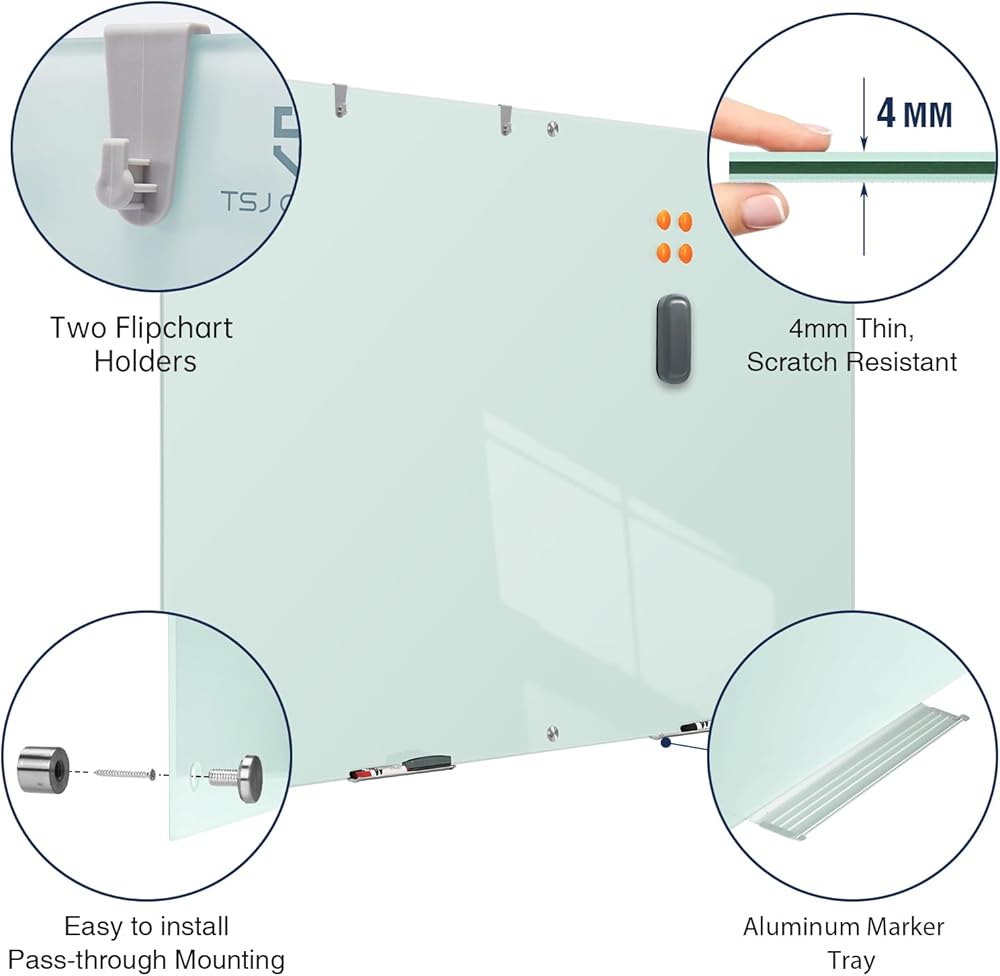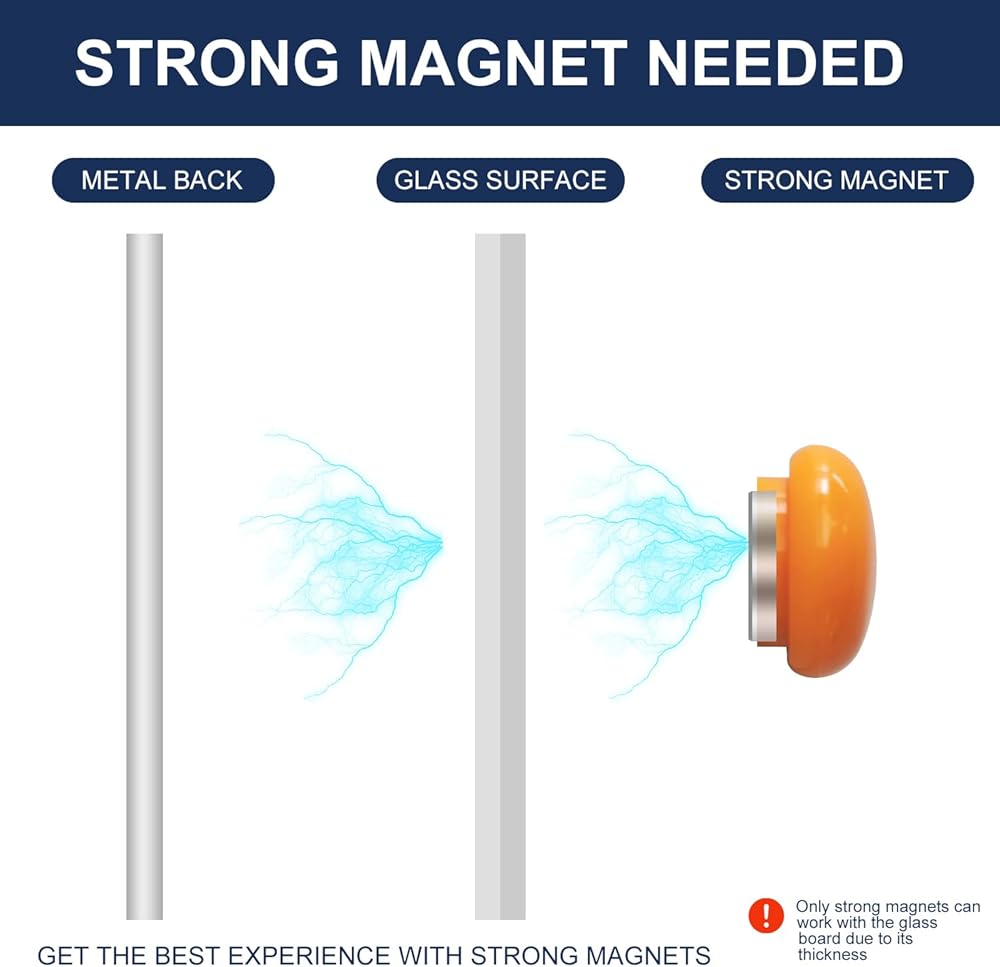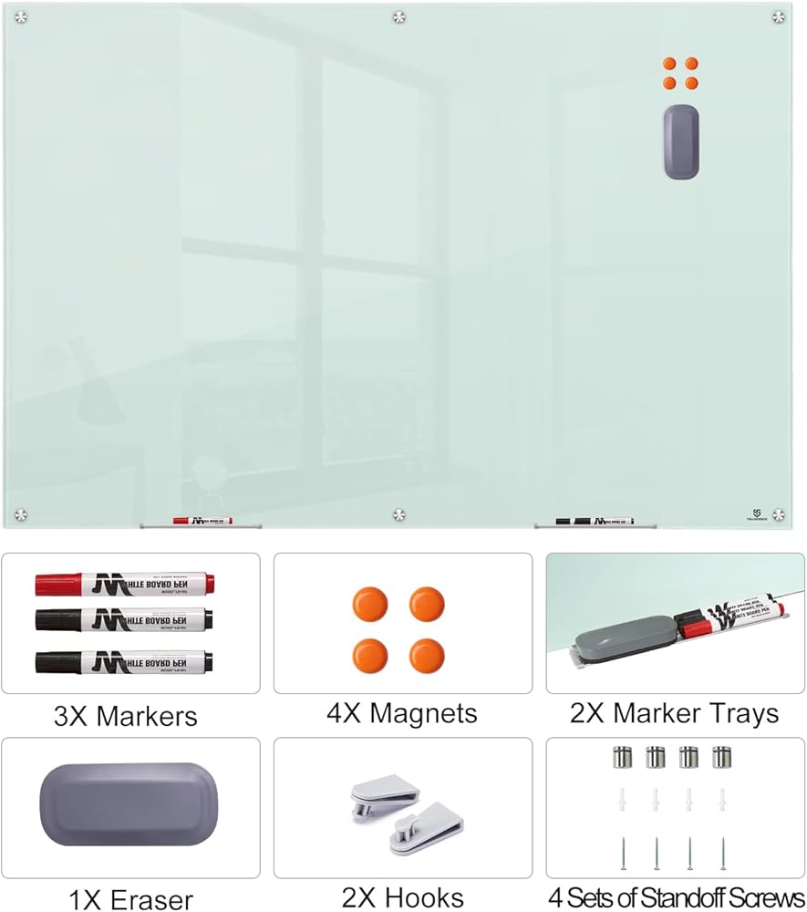 • لوحة بيضاء زجاجية مغناطيسية - تأتي اللوحة البيضاء الزجاجية الخاصة بنا مع زجاج مغناطيسي متعدد الوظائف مدعوم بالفولاذ و4 مغناطيسات زجاجية عالية الطاقة. جعل هذه السبورة الزجاجية مثالية للاجتماعات والعروض التقديمية. (ملاحظة: لن تكون المغناطيسية قوية بسبب سُمك الزجاج، فالمغناطيسات القياسية لا تعمل. الممحاة ليست مغناطيسية.)