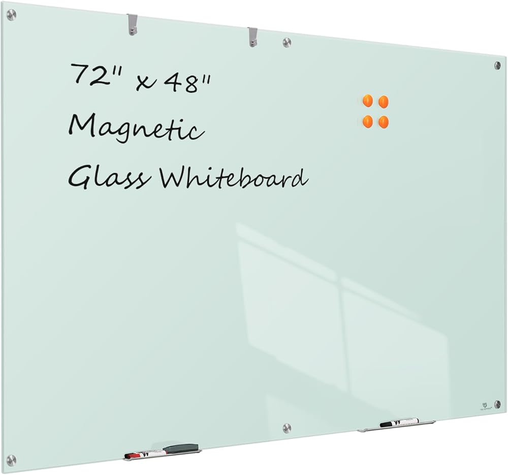 • لوح أبيض زجاجي فاخر - لوح أبيض زجاجي مقاس 72 × 48 بوصة يأتي مع سطح زجاجي مقوى أملس وقوي ومتين، يقاوم الخدوش والانبعاجات. يسمح لك هذا الزجاج الفاخر بالكتابة والمسح وإعادة الكتابة على سطح نظيف في كل مرة.