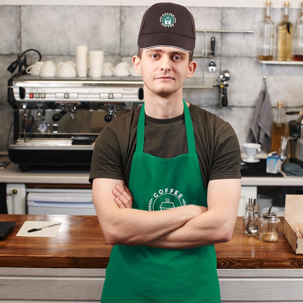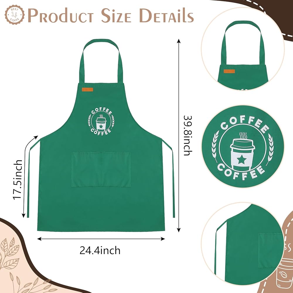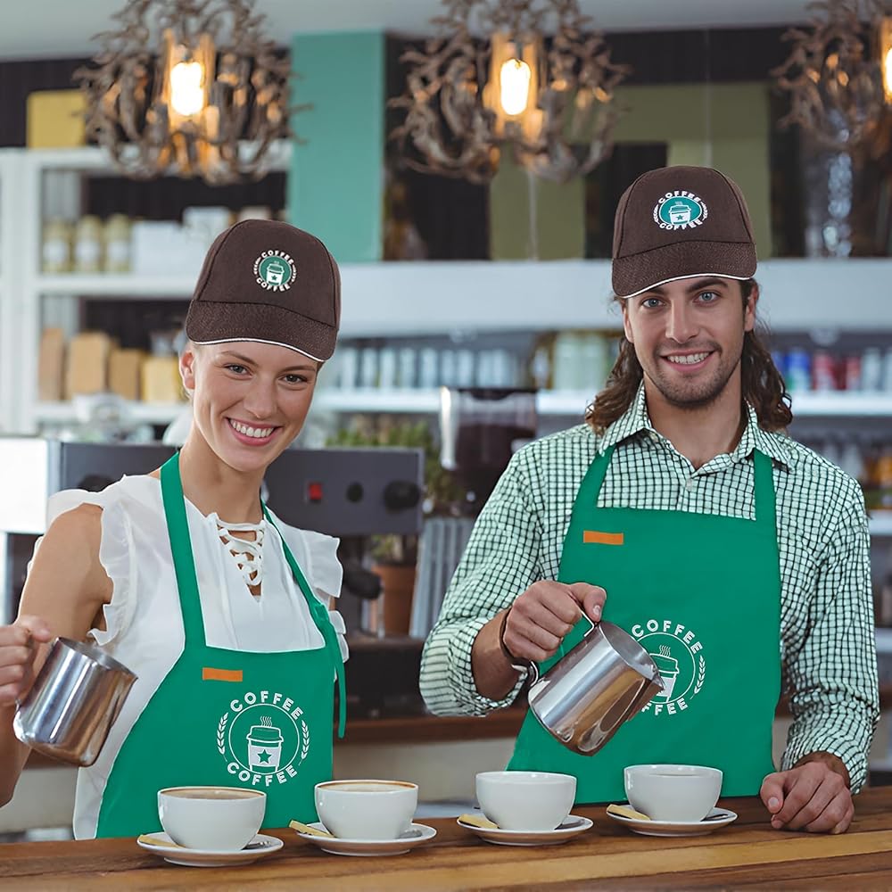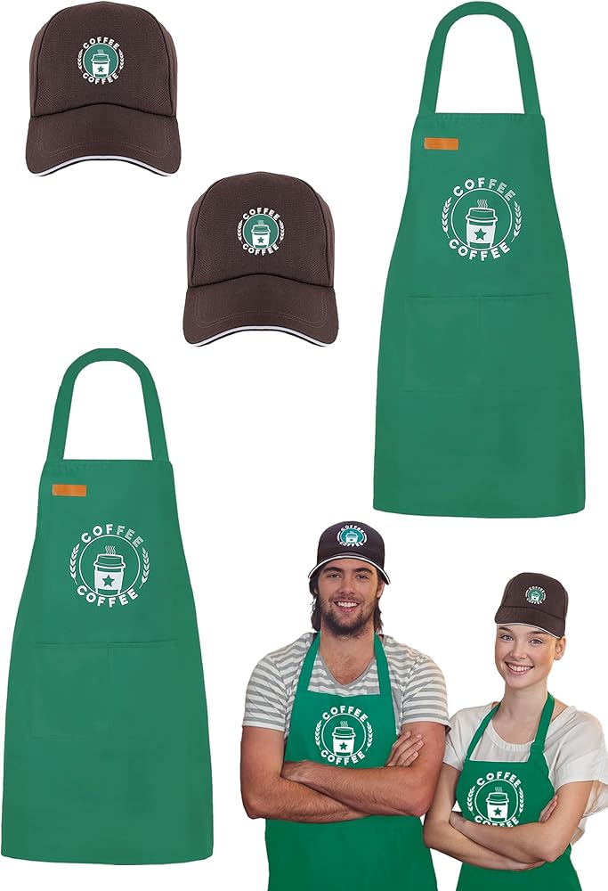 Barista costume set: Our Halloween costume set allows you to experience the role of a barista, with accessories including 2 green aprons and 2 brown hats; This design can meet your needs for role-playing and is perfect for playing the role of a barista on Halloween, experiencing a different kind of role-playing fun. You can also share it with family or friends and spend a wonderful Halloween together.