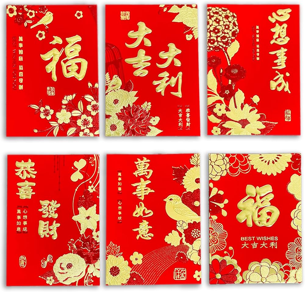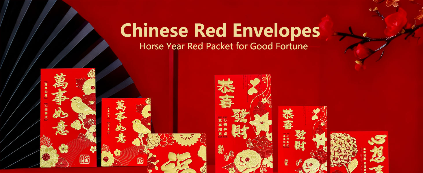 • ما ستحصل عليه: 36 قطعة من الأظرف الحمراء الصينية بيديمو (هونج باو)، كل منها مصممة بدقة لعام الحصان 2026. تتميز هذه الأظرف الورقية الحمراء الصينية بستة تصميمات فريدة، كل منها مزين بأنماط زهور ونباتات جميلة، معززة بختم رقائق الذهب. تضفي ملمسًا فاخرًا ورقيقًا. يجسد كل مظروف أحمر الأمنيات العميقة بالرخاء والحظ السعيد والبركات لكل من المانح والمتلقي في العام القادم 2026.