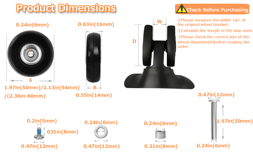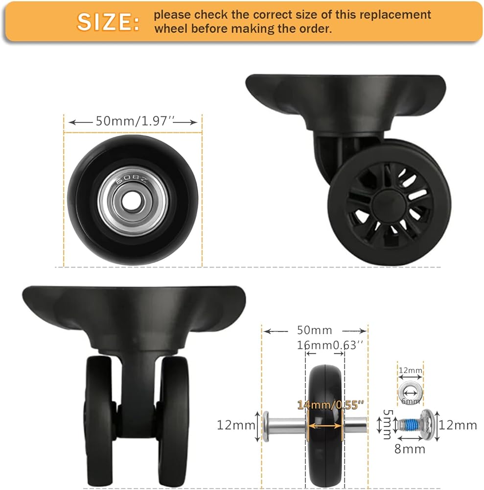 • ◉【عجلات الأمتعة 1.97 بوصة】قطر عجلة الأمتعة 1.97 بوصة (50 مم)، عرض الحافة 0.55 بوصة (14 مم)، إجمالي عرض العجلة 0.63 بوصة (16 مم) وقطر المحمل الداخلي 0.23 بوصة (6 مم). تأكد من طلب العجلات ذات الحجم نفسه الذي تستبدله لضمان خلوص الدوران والسمك المناسب.