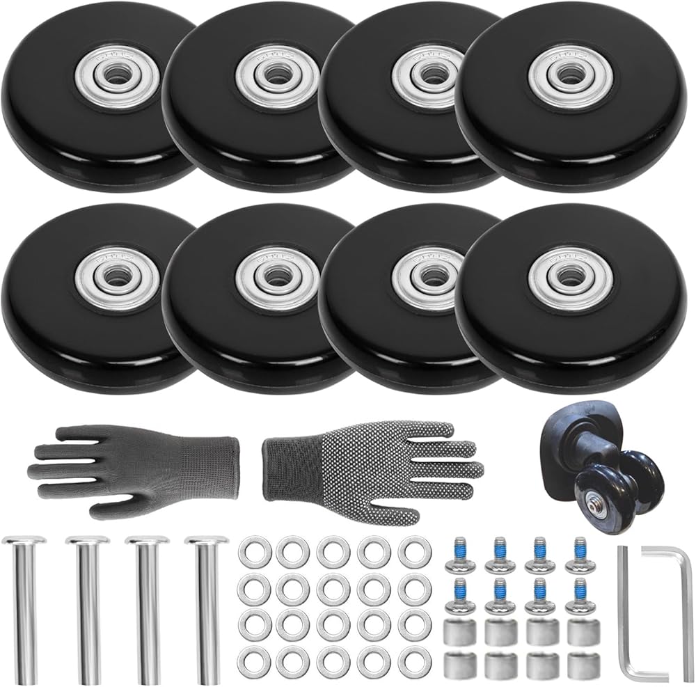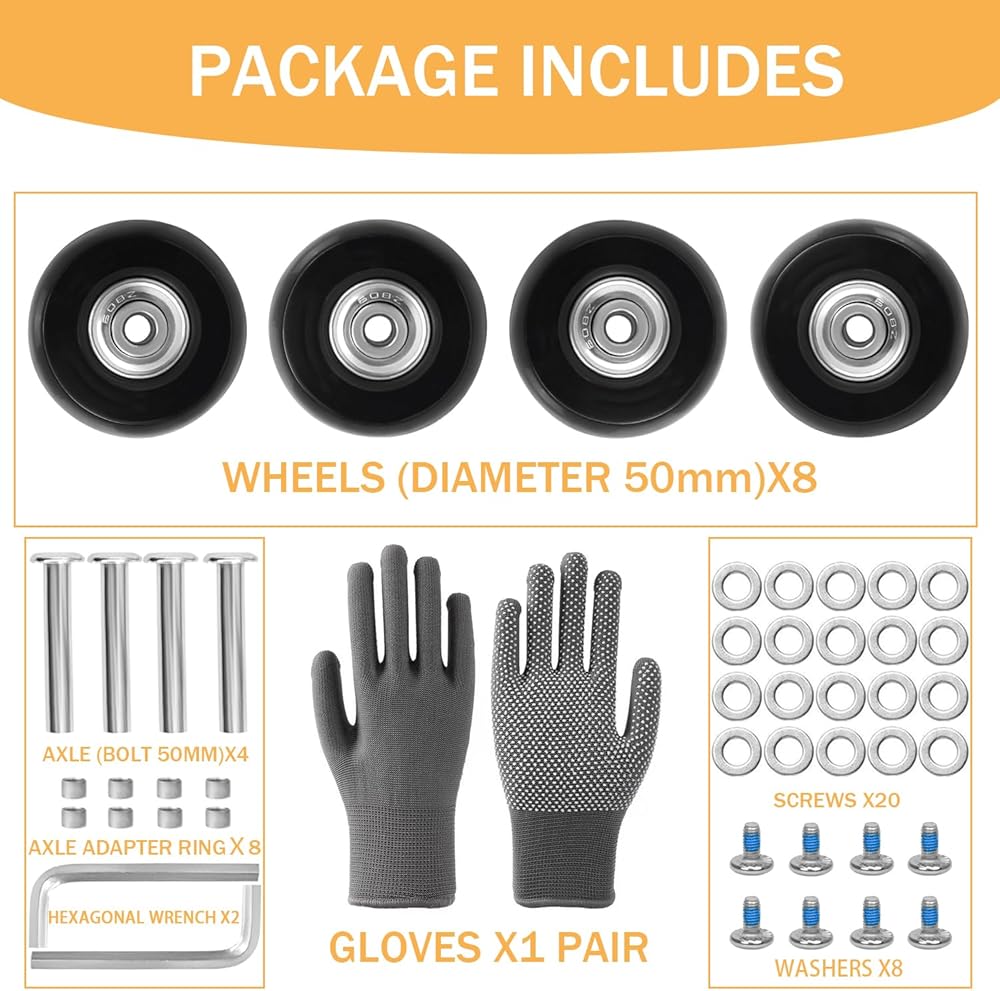 • ◉ 【مجموعة استبدال عجلة الأمتعة】 عجلات الأمتعة 1.97 بوصة (50 مم) 4 قطع، 1.97 بوصة (50 مم) المحور 4 قطع، 0.47 بوصة (12 مم) غسالات 20 قطعة، 0.47 بوصة (12 مم) مسامير 8 قطع، حلقة محول المحور 8 قطع، مفتاح ربط سداسي 2 قطعة، قفازات 1 زوج.