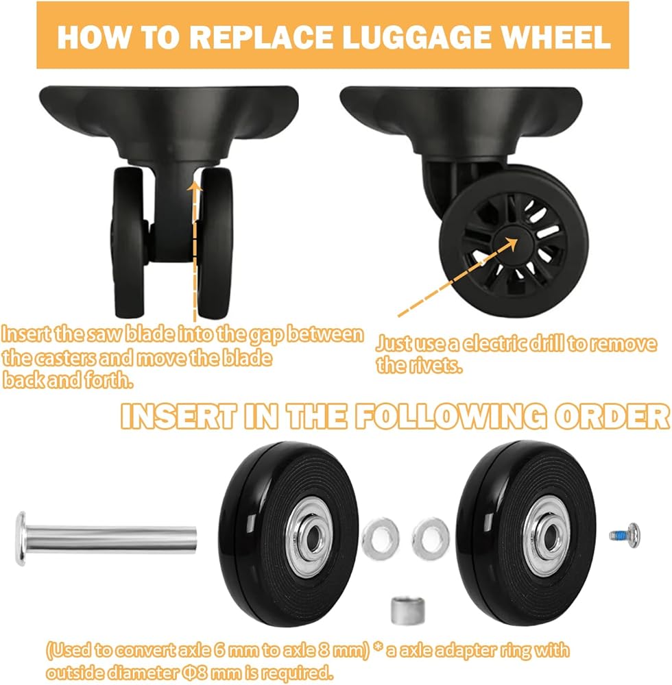 • ◉ 【جعلها اقتصادية】إذا طلبت من أحد المحترفين إصلاح عجلة حقيبتك، فسيتعين عليك شراء واحدة جديدة، والتي غالبًا ما تكون باهظة الثمن. باستخدام عجلات أمتعة السفر الخاصة بنا، يمكنك استبدالها بنفسك بسهولة. تناسب عجلات حقيبة السفر معظم الأمتعة بشكل مثالي، يرجى التحقق من الحجم الصحيح للعجلة البديلة قبل إجراء الطلب. وتتدحرج هذه العجلات على معظم المواد - أي أرضية أو رصيف أو أسفلت - بدون مشكلة.