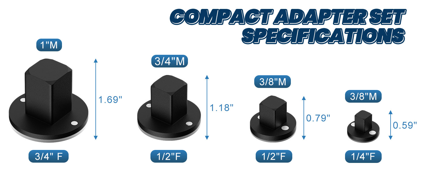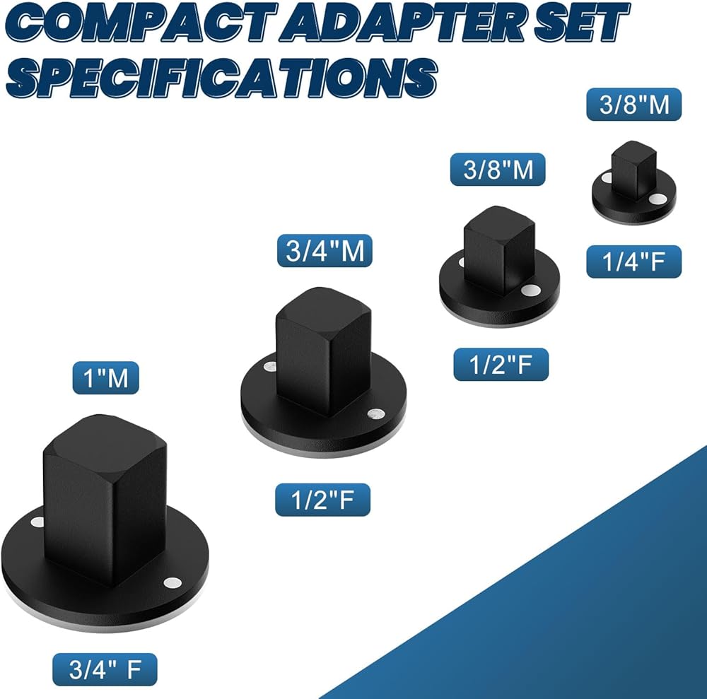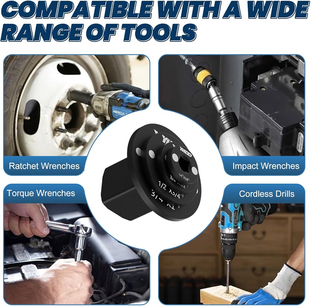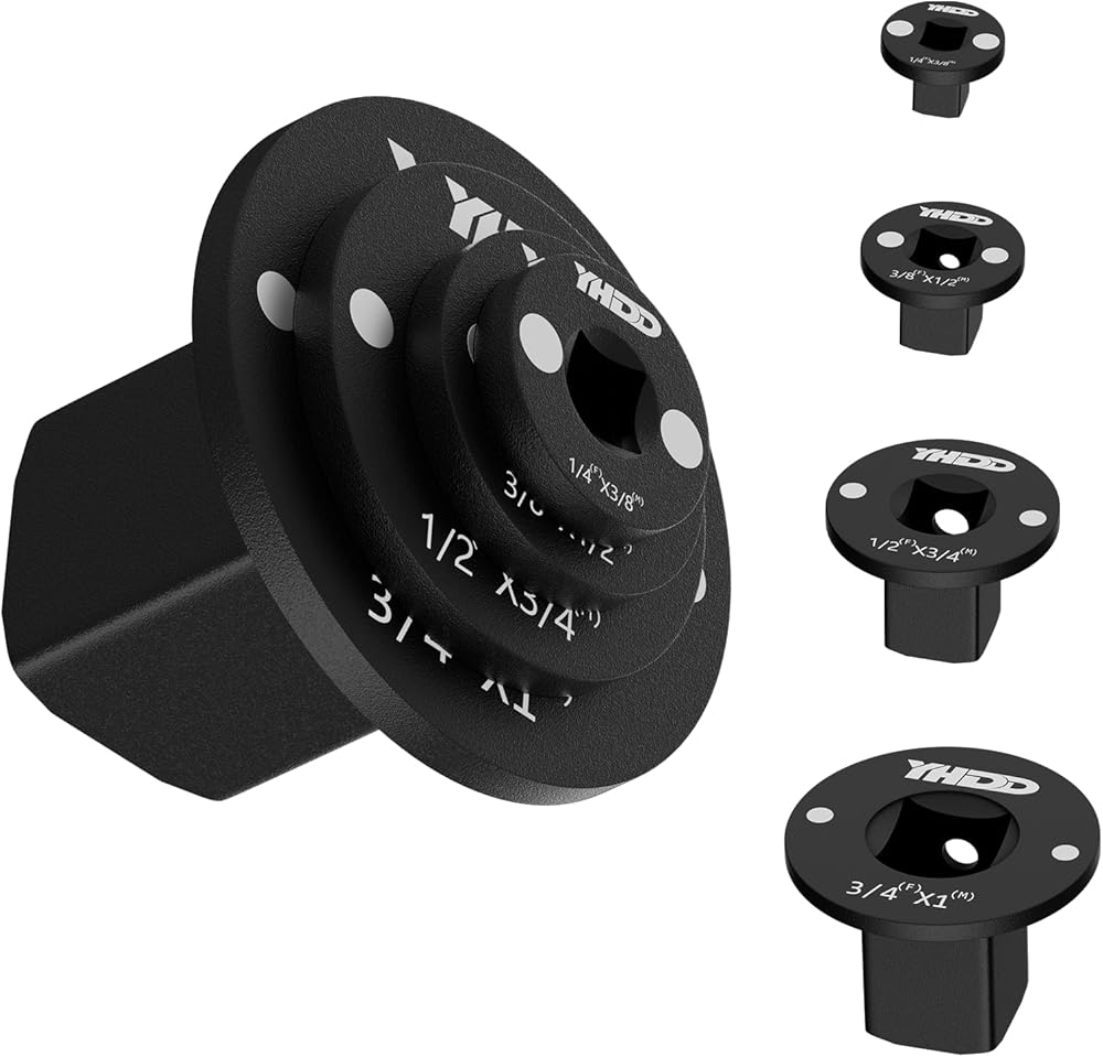 مقاسات دقيقة مكونة من 4 قطع: تشتمل مجموعة محول المقبس هذه على أربعة مواصفات - 1 بوصة إلى 3/4 بوصة، و3/4 بوصة إلى 1/2 بوصة، و1/2 بوصة إلى 3/8 بوصة، و3/8 بوصة إلى 1/4 بوصة. إنها تتيح تحويل حجم محرك الأقراص بشكل سلس لتلبية احتياجات العمل المختلفة.