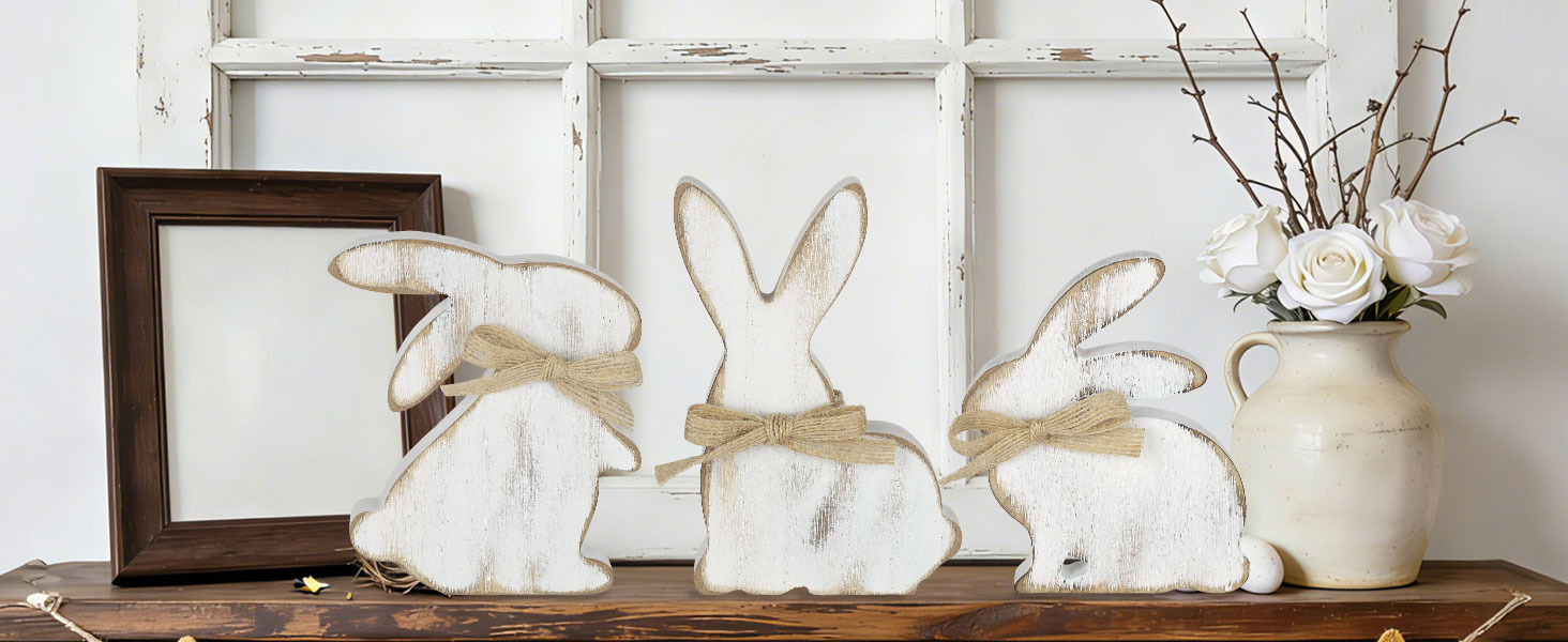 3 قطع من زينة عيد الفصح، ديكور طاولة على شكل أرنب خشبي لمنزل المزرعة، لافتة قطع مركزية على شكل أرنب ريفي للمنزل، لوازم حفلات المكتب (أبيض) in Kuwait