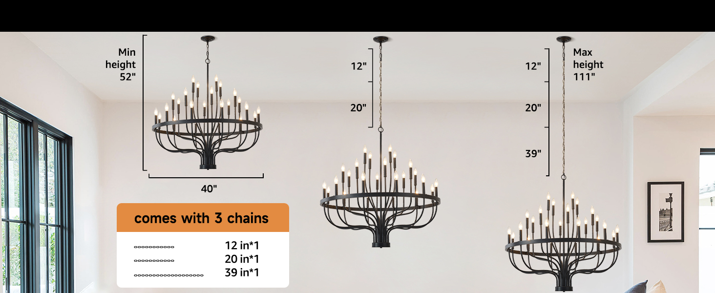 ارتفاع قابل للتعديل -- الثريا مجهزة بثلاث سلاسل تعليق، بقياس 12 بوصة، و20 بوصة، و40 بوصة على التوالي، بإجمالي 72 بوصة. يمكنك بسهولة ضبط الارتفاع بين 12 بوصة و72 بوصة. إذا كنت تريد أن تكون السلسلة أقصر من 12 بوصة، فما عليك سوى إزالة بعض الوصلات المعدنية من السلسلة. مناسبة بشكل خاص للأسقف المسطحة والمنحدرة والمقببة