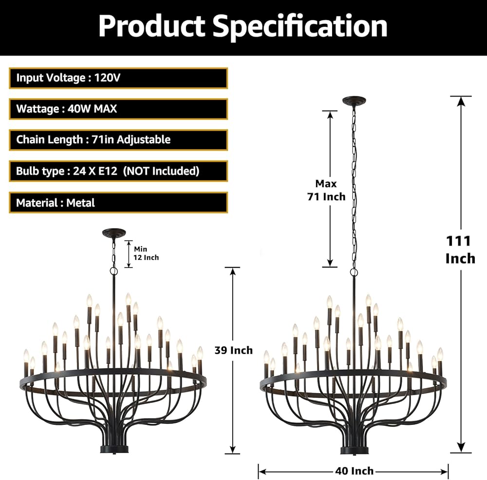 مصابيح متوافقة وقابلة للتعتيم - مجهزة بـ 24 مقبس E12، الثريا متوافقة مع مصابيح الإضاءة E12، مع طاقة قصوى تبلغ 40 وات لكل لمبة. عند استخدامها مع مصابيح الإضاءة القابلة للتعتيم ومفتاح التعتيم المتوافق، يمكن أن تكون خافتة بالكامل، مما يخلق جوًا عتيقًا وأجواء دافئة ومريحة وناعمة (المصابيح غير متضمنة)