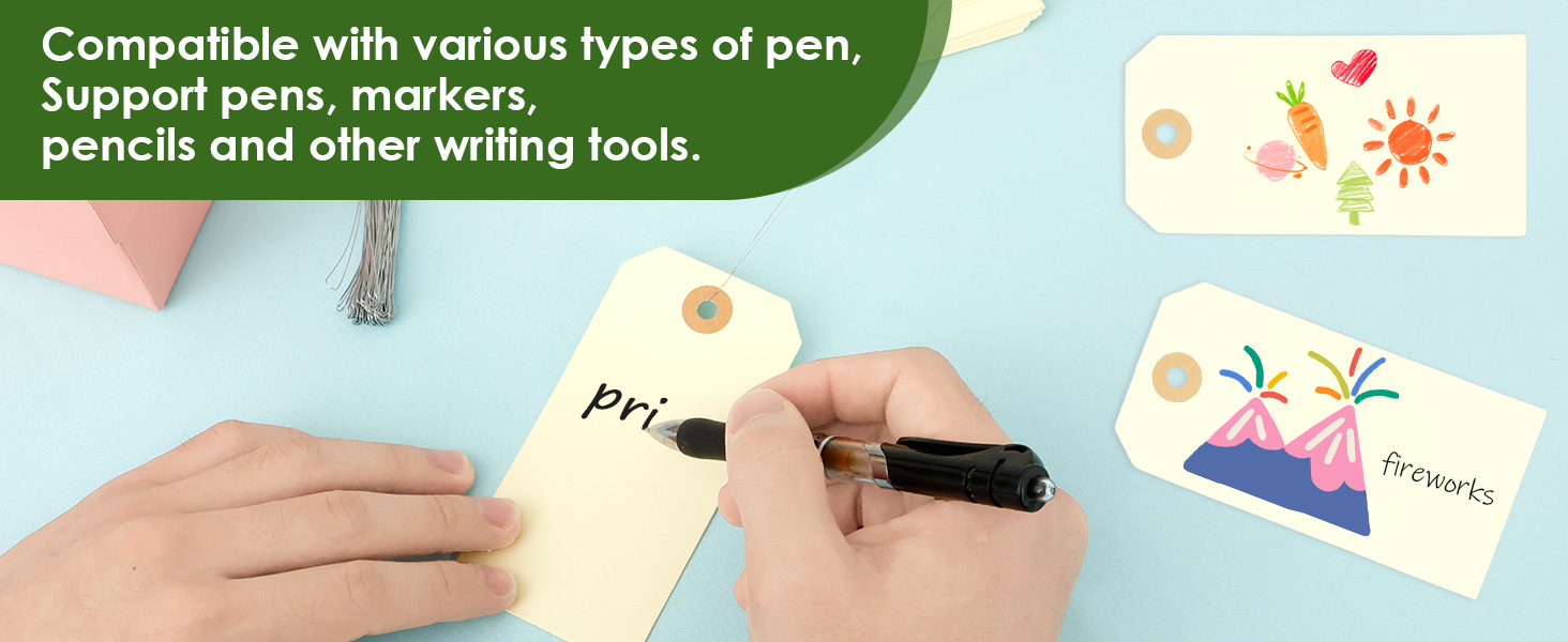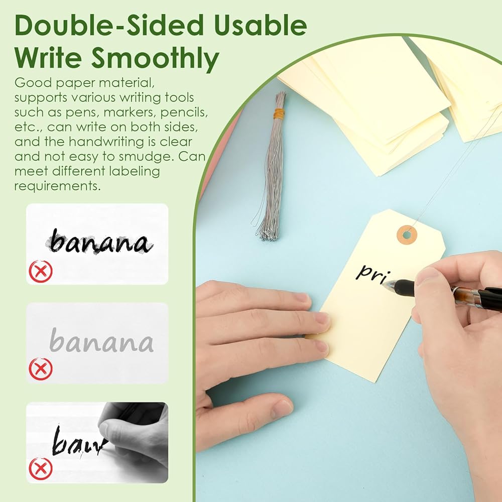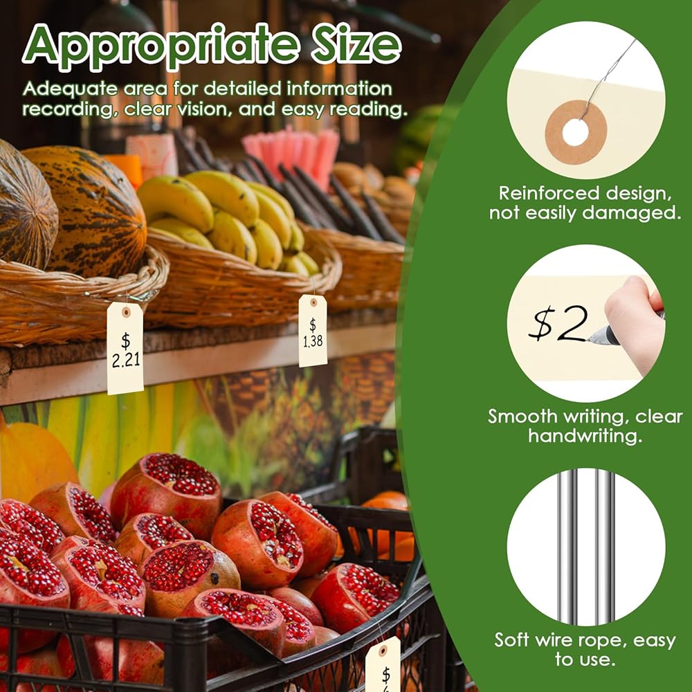 فتحات معززة: تتميز كل علامة ورقية من ورق الكرافت بفتحة معززة، مصممة لاستيعاب الأسلاك المعدنية مع منع التمزق. هذا السلك المعدني مقاوم للتآكل، ويمكن أن يبقى سليمًا حتى بعد الاستخدام طويل الأمد، حتى في السوق والمستودعات وسيناريوهات الاستخدام المتكرر الأخرى. يمكن أن تلعب أيضًا دورًا ثابتًا في وضع العلامات