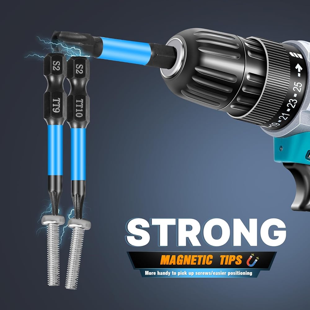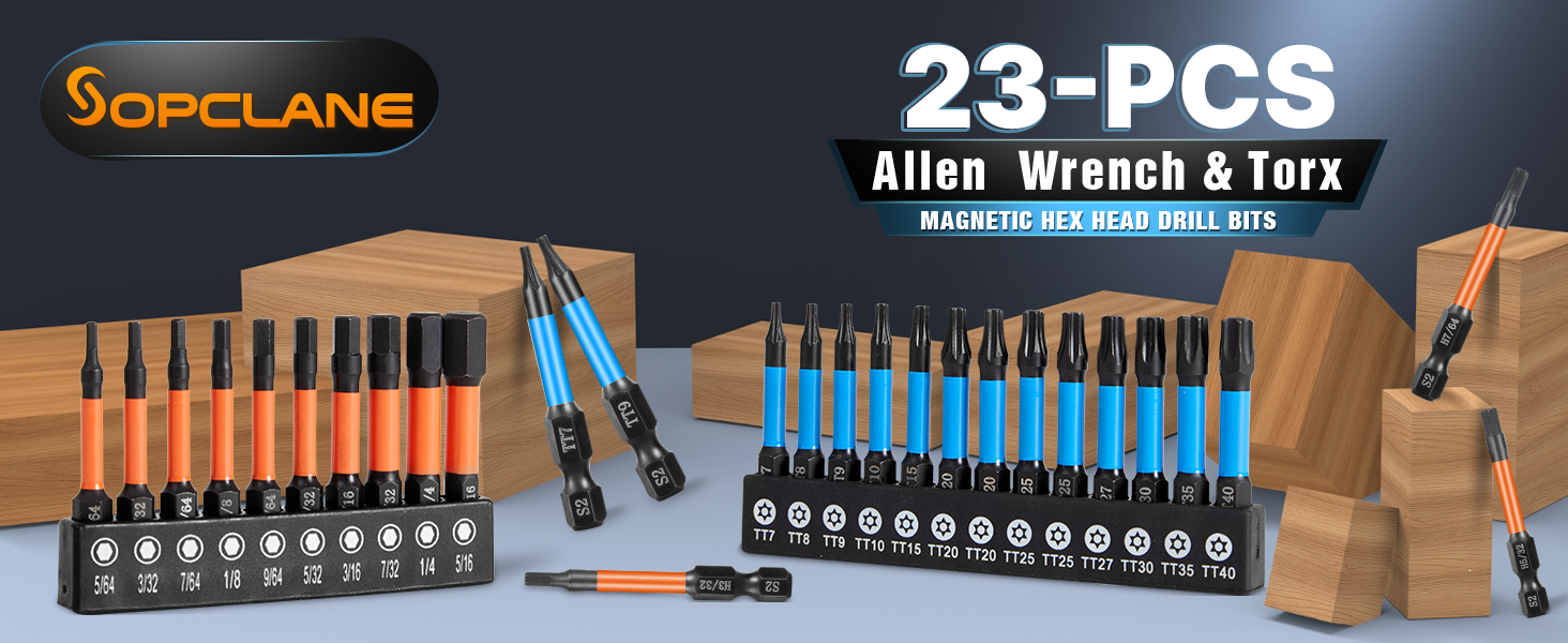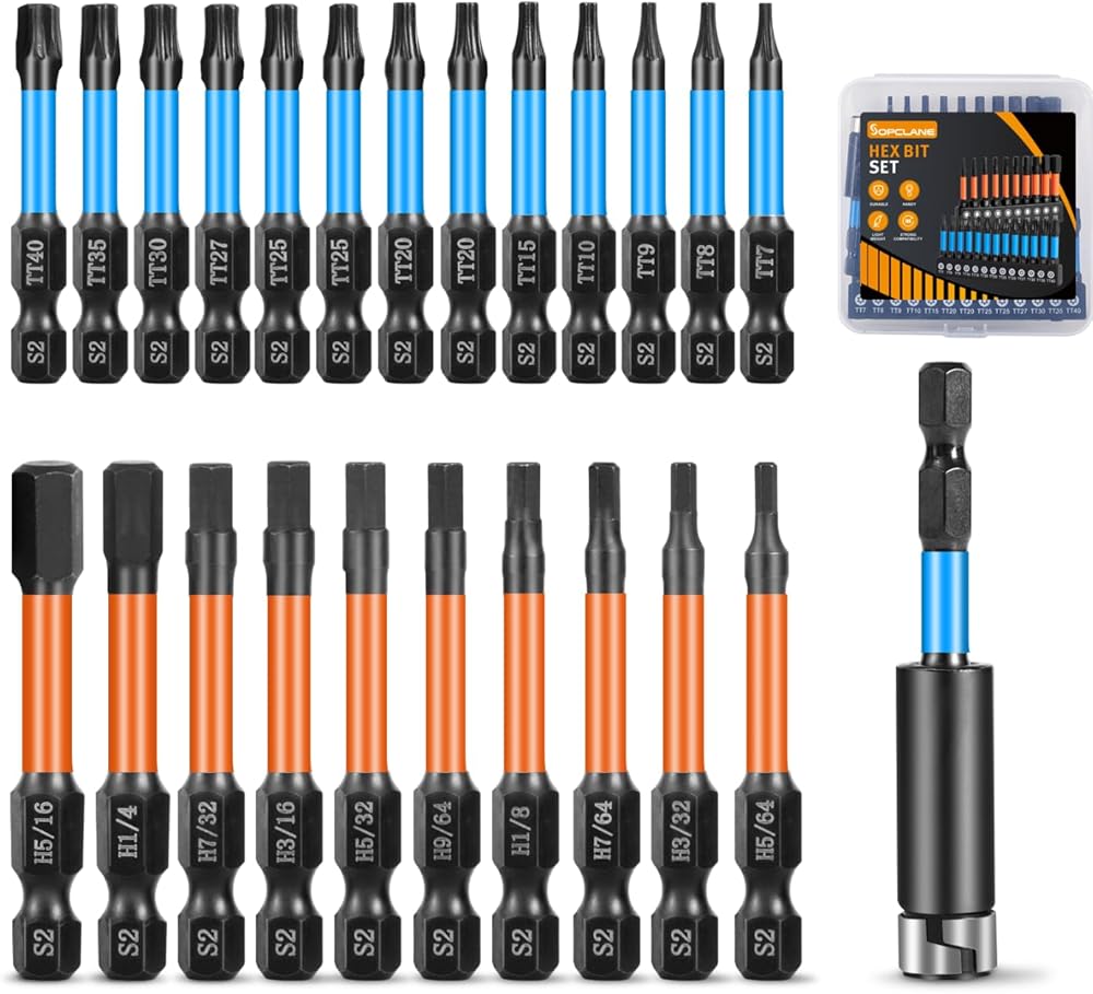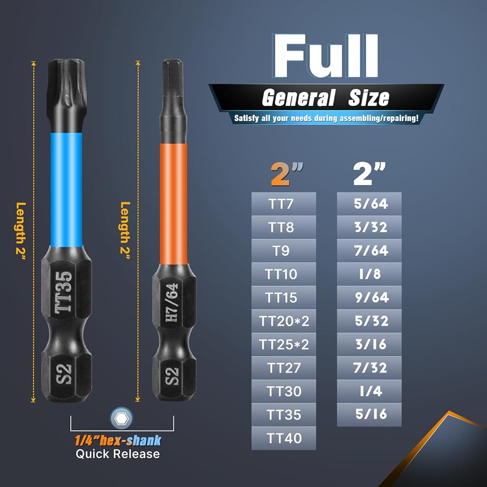 مجموعة لقم توركس 13 قطعة (T7-T40) و10 قطع لقمة مثقاب مفتاح ألين برأس سداسي (SAE)، لقم مفك ذات تأثير طويل مقاس 2 بوصة مع حامل لقمة مغناطيسية وصندوق تخزين، مجموعة مفكات براغي سداسية من الفولاذ S2 مقاس 1/4 بوصة