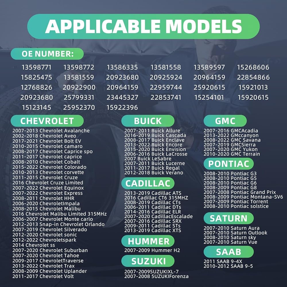 【التوافق: مستشعر ضغط الإطارات HUNBILFIN مناسب لمعظم مركبات GM. لسيارة Buick Allure/Cascada/Enclave/Encore/Envision/LaCrosse/LeSabre/Lucerne/Regal/Verano، إلخ. يرجى الرجوع إلى وصف المنتج لتطبيق محدد للطراز والسنة.
