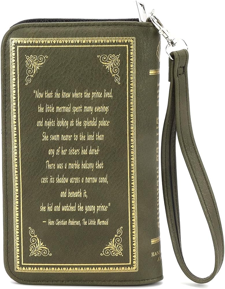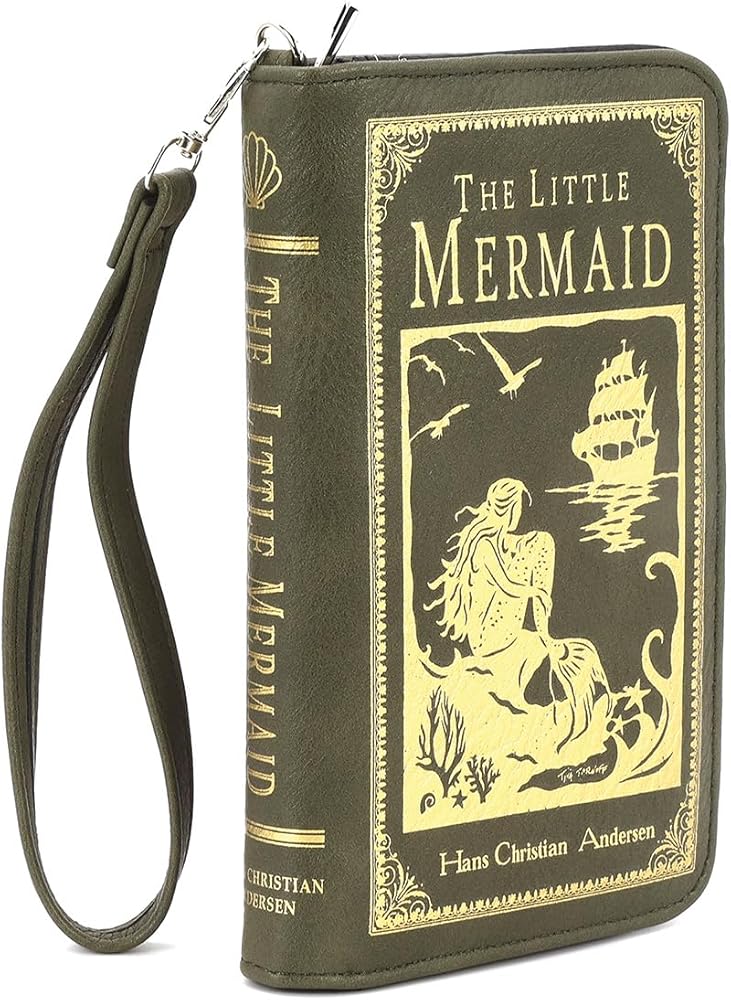 Immerse yourself in the enchanting tale of The Little Mermaid with this captivating book wallet. Crafted with meticulous attention to detail, this wallet showcases the iconic cover illustration of the beloved fairy tale by Hans Christian Andersen. The vibrant green faux leather exterior features an embossed golden border and title, transporting you to the mystical underwater world. Inside, the wallet unfolds to reveal a striking silhouette of the mermaid, gazing longingly at a ship sailing across the moonlit sea. Perfectly sized to carry your essentials, this book wallet is not only a stylish accessory but also a cherished keepsake for literature enthusiasts. Embrace the magic of storytelling and let your imagination soar with this exquisite piece.
