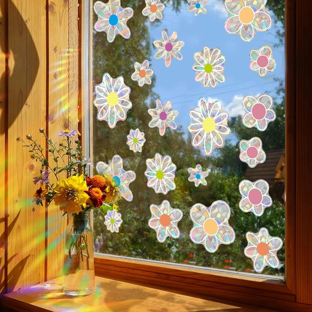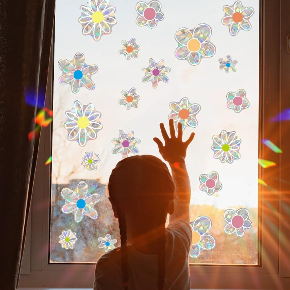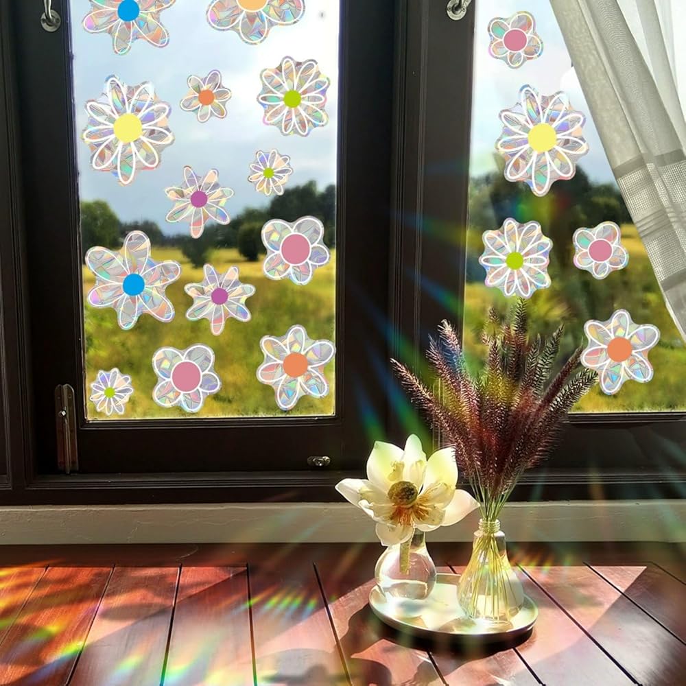 ملصقات نافذة الربيع والصيف على شكل زهرة الأقحوان، نافذة منشورية لامعة على الوجهين، ملصقات نافذة على شكل زهور لطيفة لتزيين النوافذ من الزهور الملونة للمرآة الزجاجية، متجر المكتب والمدرسة