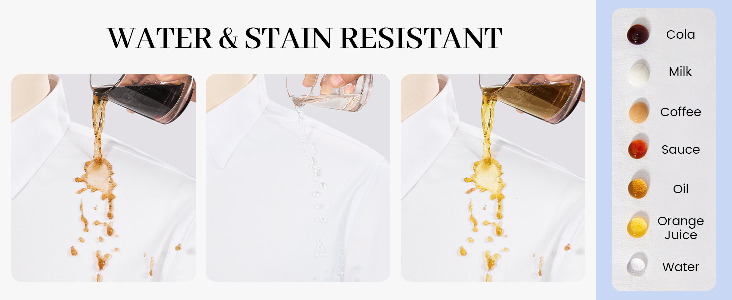 Made of 77% polyester, 20% cotton, 3% spandex: the special finish repels stains, water, and oil (spills bead up, oil wipes off). Cotton ensures breathability for summer, while 3% spandex adds stretch for desk work or daily moves.