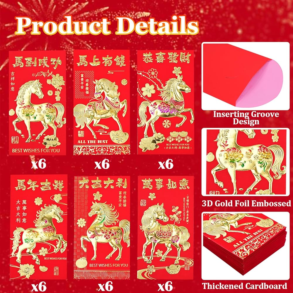 36PCS Chinese New Year Red Envelopes, 2026 New Years Eve Party Supplies New Years Decorations, Lunar New Year Envelopes, Chinese New Year Gifts, Lunar New Year Gifts, Red Envelope Horse