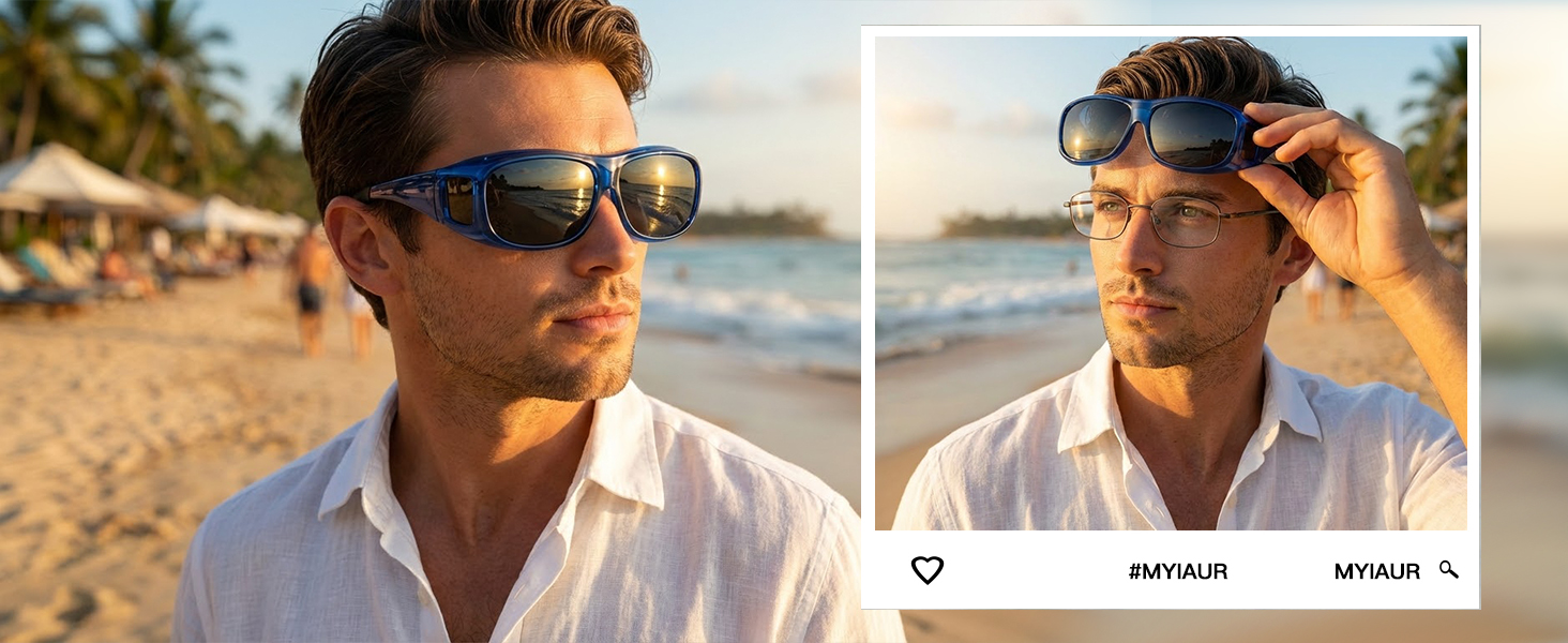 تناسب النظارات الشمسية: يمكن ارتداء النظارات الشمسية المستقطبة من Myiaur بمفردها كإكسسوار للأزياء أو وضعها بسهولة فوق نظارتك الحالية للاستخدام اليومي. يتميز الإطار العلوي بحافة، بينما توفر الأذرع العريضة ملاءمة محكمة على نظارتك، مما يضمن تثبيتًا آمنًا دون الانزلاق.
