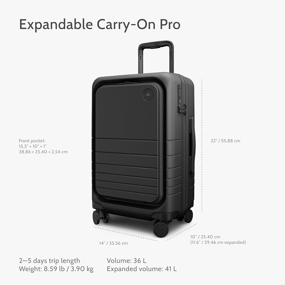 Carry‑on specs: 22" x 14" x 10" (11.6" expanded); 8.59 lb; ~36–41 L volume. Fits most overheads when not expanded.
