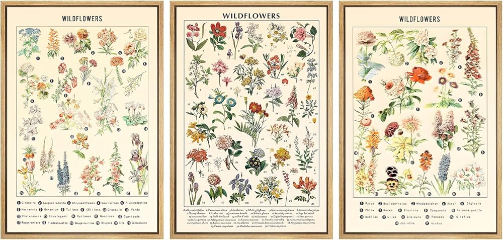 [لوحة فنية جدارية على شكل زهور برية عتيقة]: مقاس 12 بوصة × 16 بوصة × 3 قطع (30 × 40 سم × 3 قطع) مؤطرة، جاهزة للتعليق.
