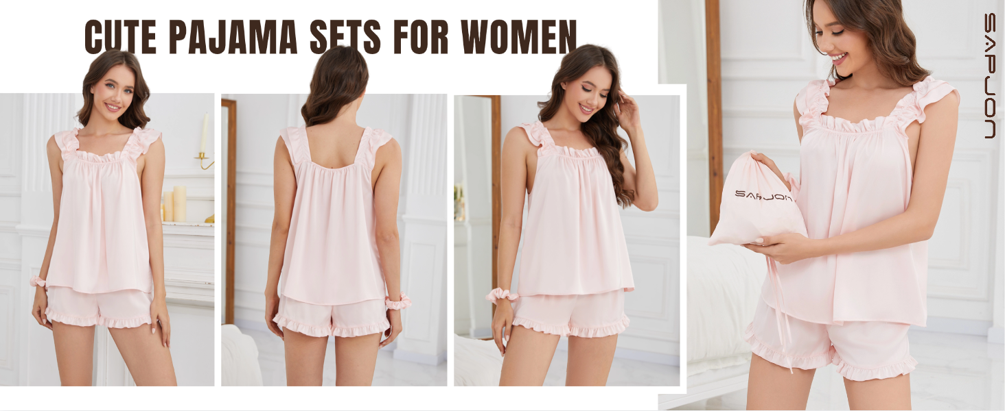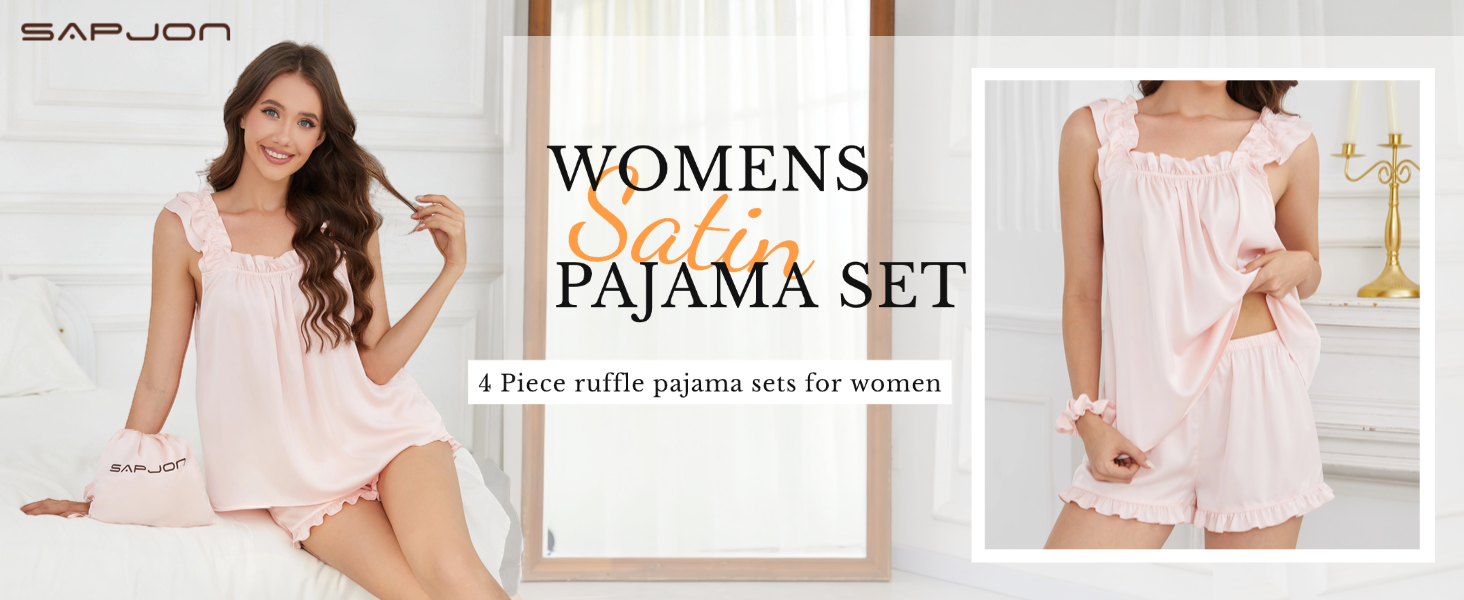 طقم بيجامة حريمي من SAPJON مكون من 4 قطع من الحرير الناعم المكشكش Pj بدون أكمام وسروال قصير ملابس نوم بيجامات الزفاف in Kuwait