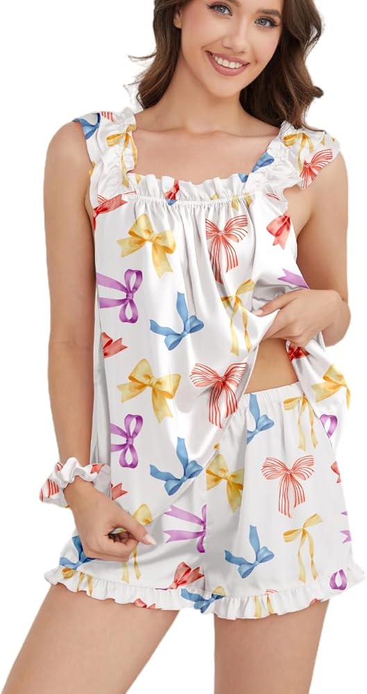 • 【مجموعة بيجامة لطيفة مكونة من 4 قطع】 تتضمن قميصًا بدون أكمام مكشكشًا وسروالًا قصيرًا مكشكشًا وربطات شعر من الساتان وحقيبة تخزين من الساتان. يمنح التصميم المكشكش لحزام الكتف شعورًا جميلاً ومرحًا. يتميز النمط غير الرسمي للقميص بدون أكمام بشمولية عالية لأشكال الجسم ويظل مجانيًا للغاية. حقيبة تخزين من الساتان تحافظ على تنظيم المجموعات في حقائب السفر أو خزانة الملابس، مريحة وعملية للغاية