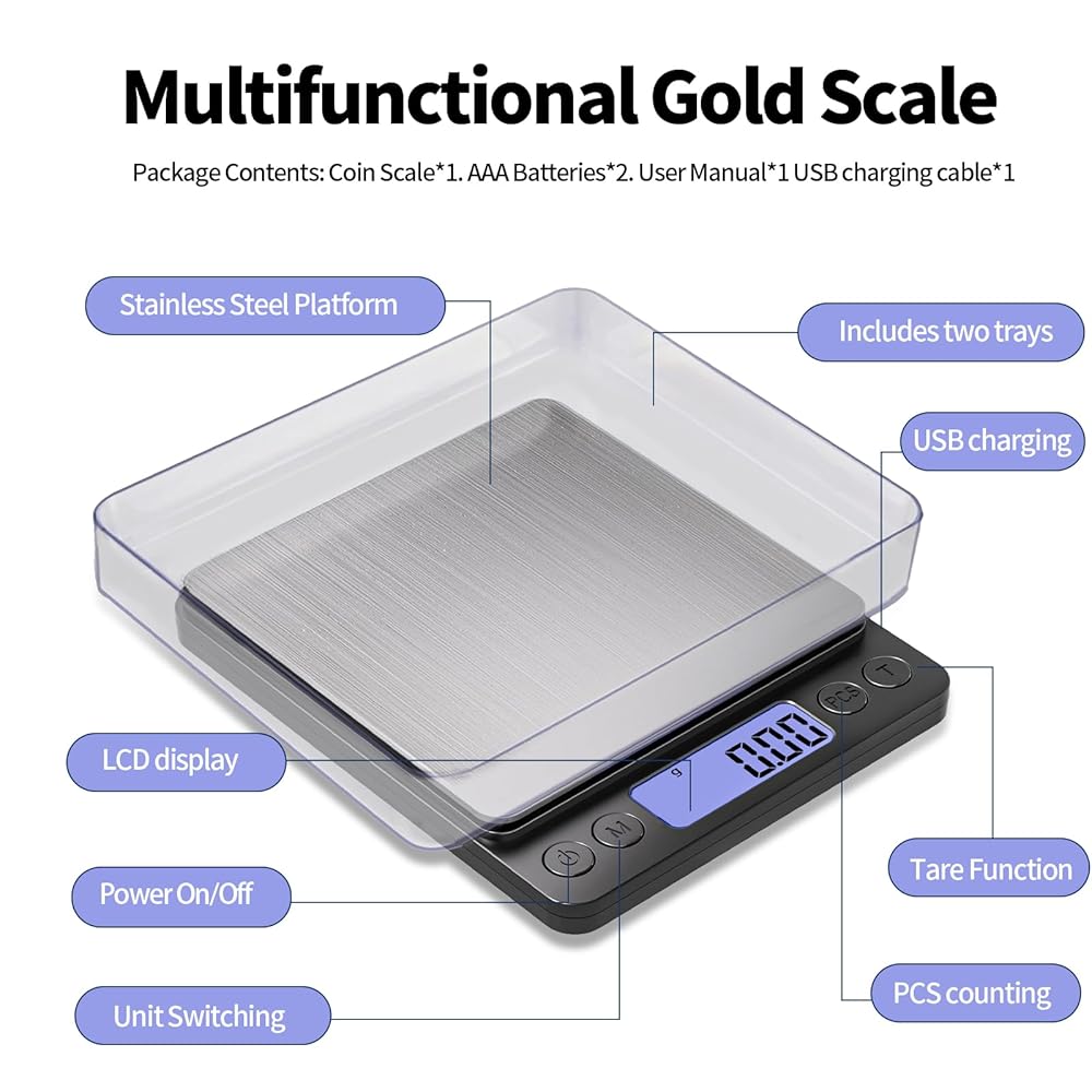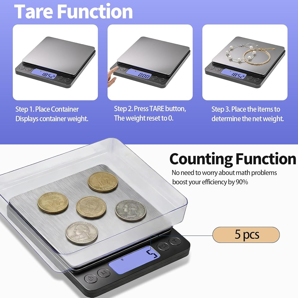 【مقياس مختبر/مطبخ متعدد الوظائف】- اختر الوحدات المفضلة لديك بوحدات g وct وdwt وozt وoz وgn وlb وtl وml وقم بالتحويل بين الوحدات على الفور بالضغط على زر M دون الحاجة إلى إعادة القياس. بينما يمكن للآخرين توفير 6 وحدات أقل من دقة 0.01 جرام. وظيفة TARE لصفر وزن الجسم الموجود على المنصة. تتيح وظيفة PCS إمكانية حساب العناصر الصغيرة المتطابقة مثل الدبابيس والخرز والمسامير. كما أنه يتميز أيضًا بوجود أجهزة الكمبيوتر الشخصية، وإيقاف التشغيل التلقائي، وطاقة البطارية المنخفضة، والتحميل الزائد للاستخدام اليومي.