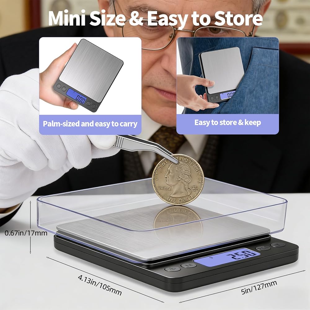 【مادة فائقة الجودة】مصنوعة من منصة من الفولاذ المقاوم للصدأ 304 عالية الجودة وإطار من بلاستيك أكريلونتريل بوتادين ستايرين، دقة مقياس الجرام 0.01 جرام متينة وسهلة التنظيف والصيانة. الحجم الصغير 4.9 × 3.9 × 0.7 بوصة مناسب أيضًا لإحضاره إلى المختبر للاستخدام.