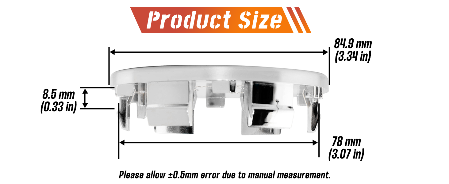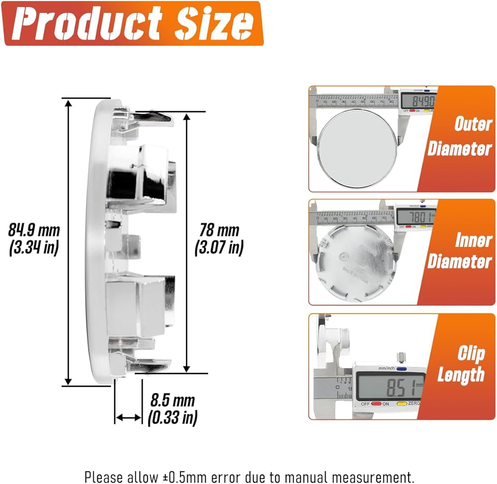 🚘 الحجم: الحد الأقصى للقطر الخارجي: 85 مم (3.35 بوصة)، القطر الخارجي للقاعدة: 78 مم (3.07 بوصة)، طول المشبك: 8.5 مم (0.33 بوصة)، إجمالي طول المشبك: 15.9 مم (0.63 بوصة). إذا لم تكن متأكدًا، استخدم الفرجار الرقمي للتحقق من أبعاد الفتحة المركزية. التثبيت الناجح ممكن للنماذج التي يكون فيها خطأ معلمة قطر مركز أغطية الحافة في حدود 0.5 مم.