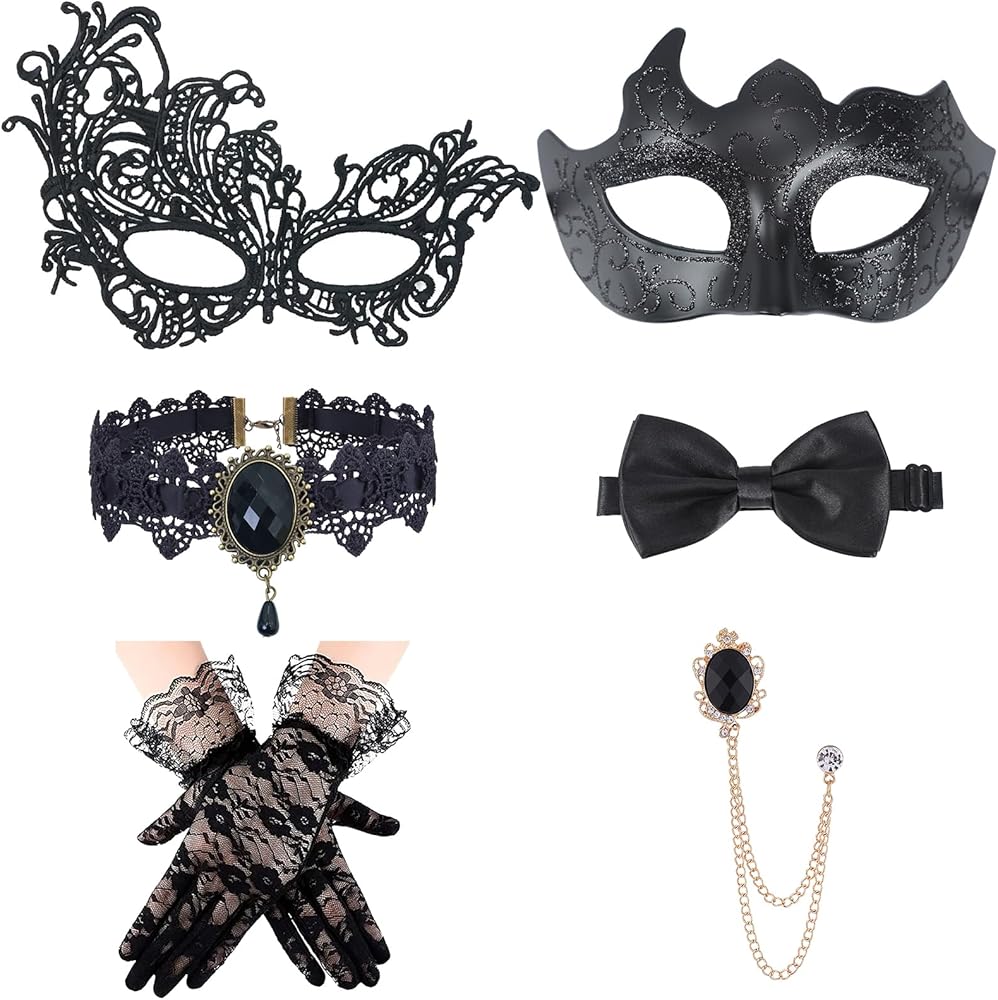 • مجموعة مثالية للأزواج: تم تصميم مجموعة الملحقات التنكرية هذه المكونة من 6 قطع للأزواج، بما في ذلك قناع رجالي، وقناع دانتيل نسائي، وقفازات دانتيل سوداء، وقلادة، وربطة عنق، وبروش من حجر الراين. المجموعة الكاملة تضمن لك ولشريكك الظهور بمظهر لا تشوبه شائبة في أي مناسبة