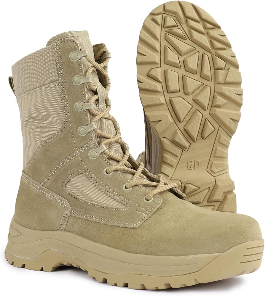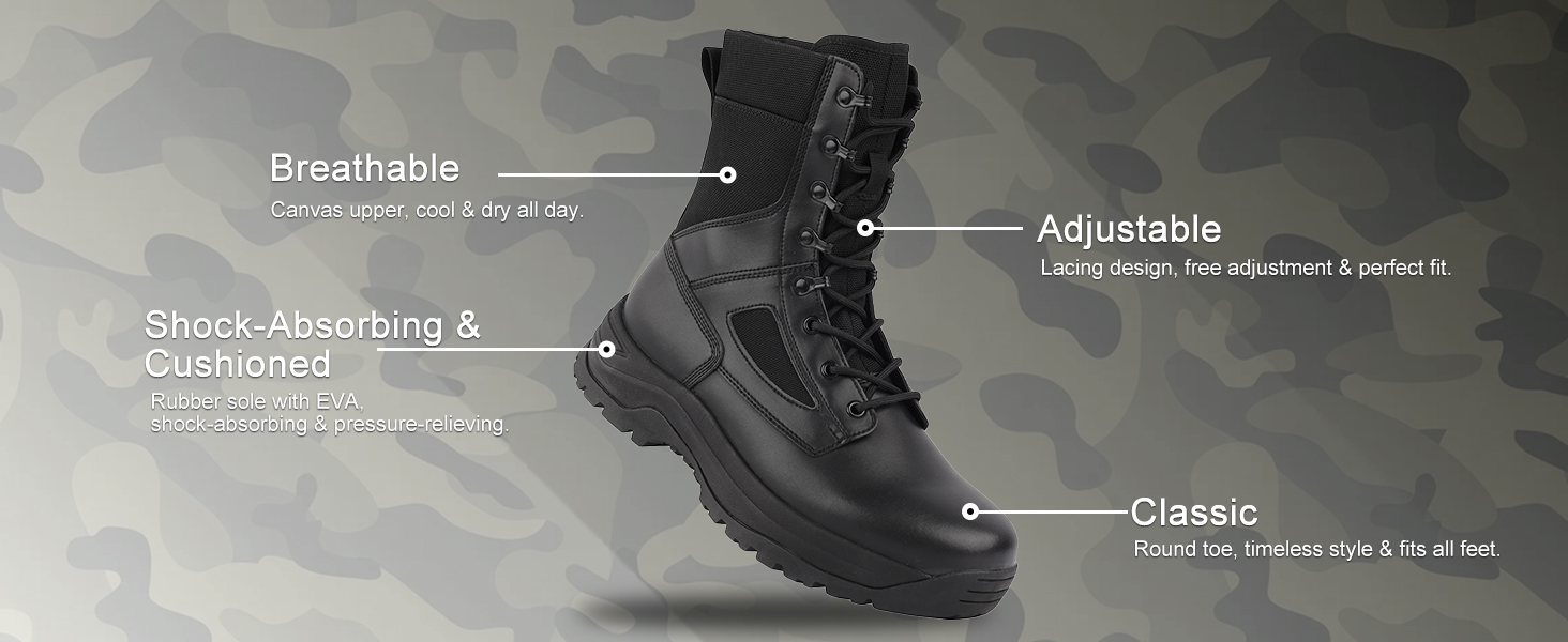 • قابل للكسر: الجزء العلوي من القماش للأحذية العسكرية يعزز الدورة الدموية، بينما تحافظ البطانة الشبكية على جفاف قدميك. حتى أثناء ساعات العمل الطويلة أو المشي لمسافات طويلة، تظل مريحة وجيدة التهوية.