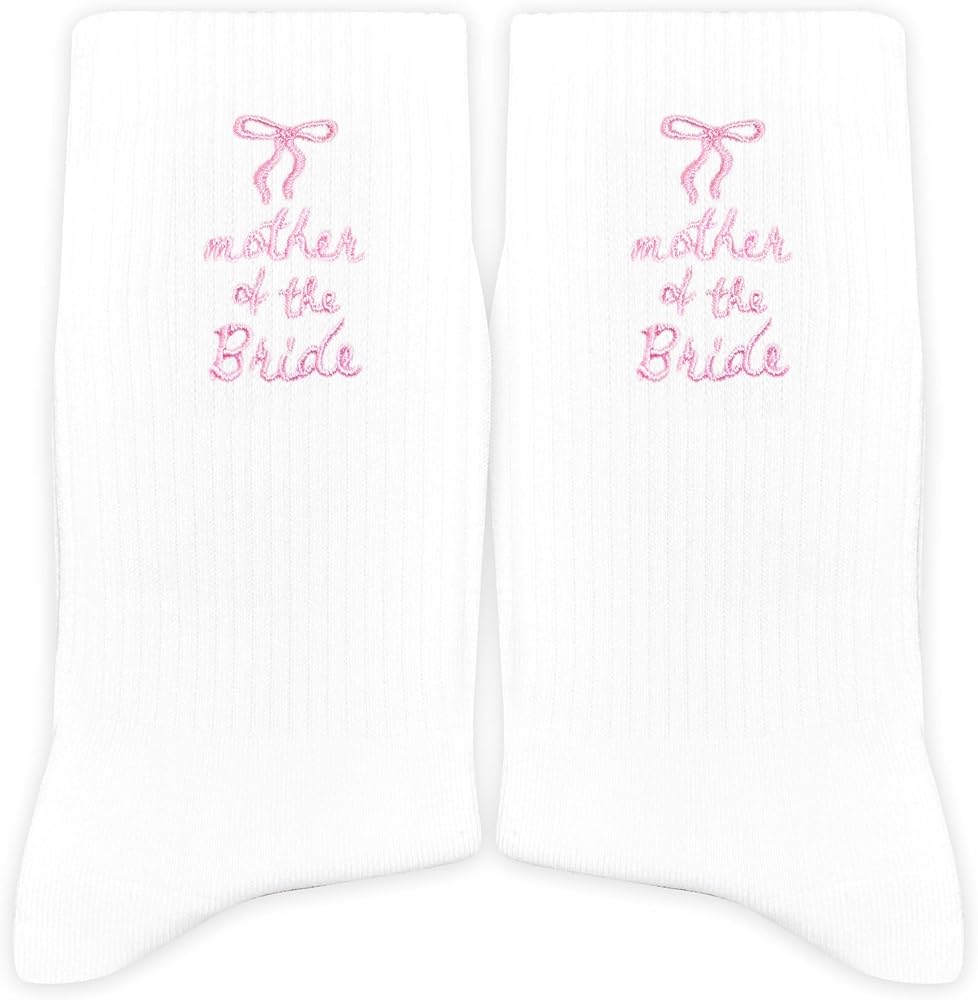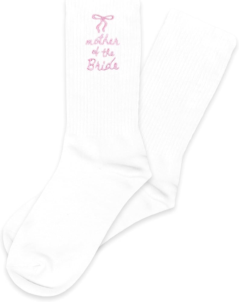 Celebrate the wedding day with these charming mother of the bride embroidered socks. Featuring a sweet pink bow and elegant script on a clean white base, these socks are a heartfelt accessory for the bride's mom. Perfect for wedding morning photos, thoughtful gift boxes, or as a lasting keepsake to treasure long after the celebration.