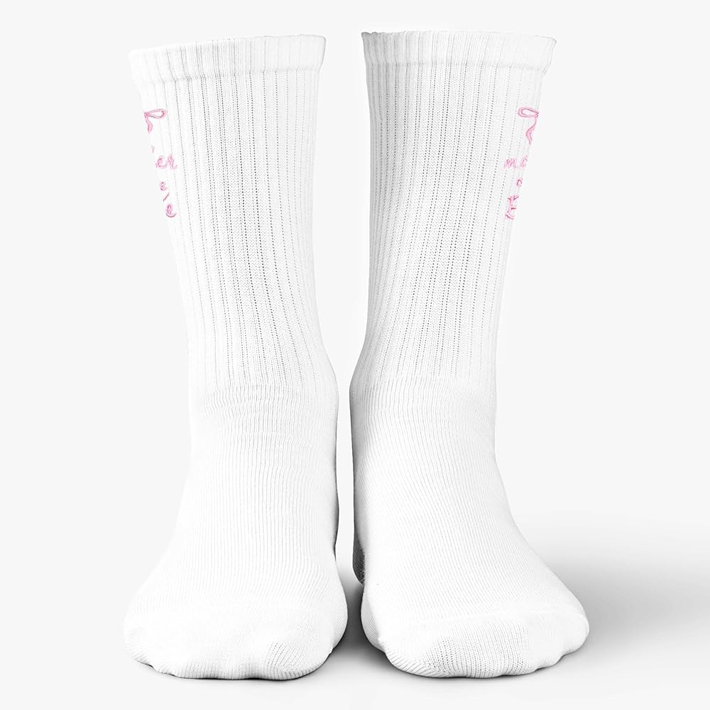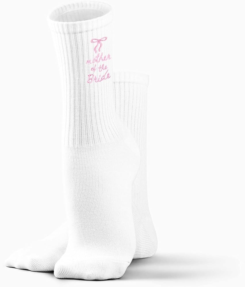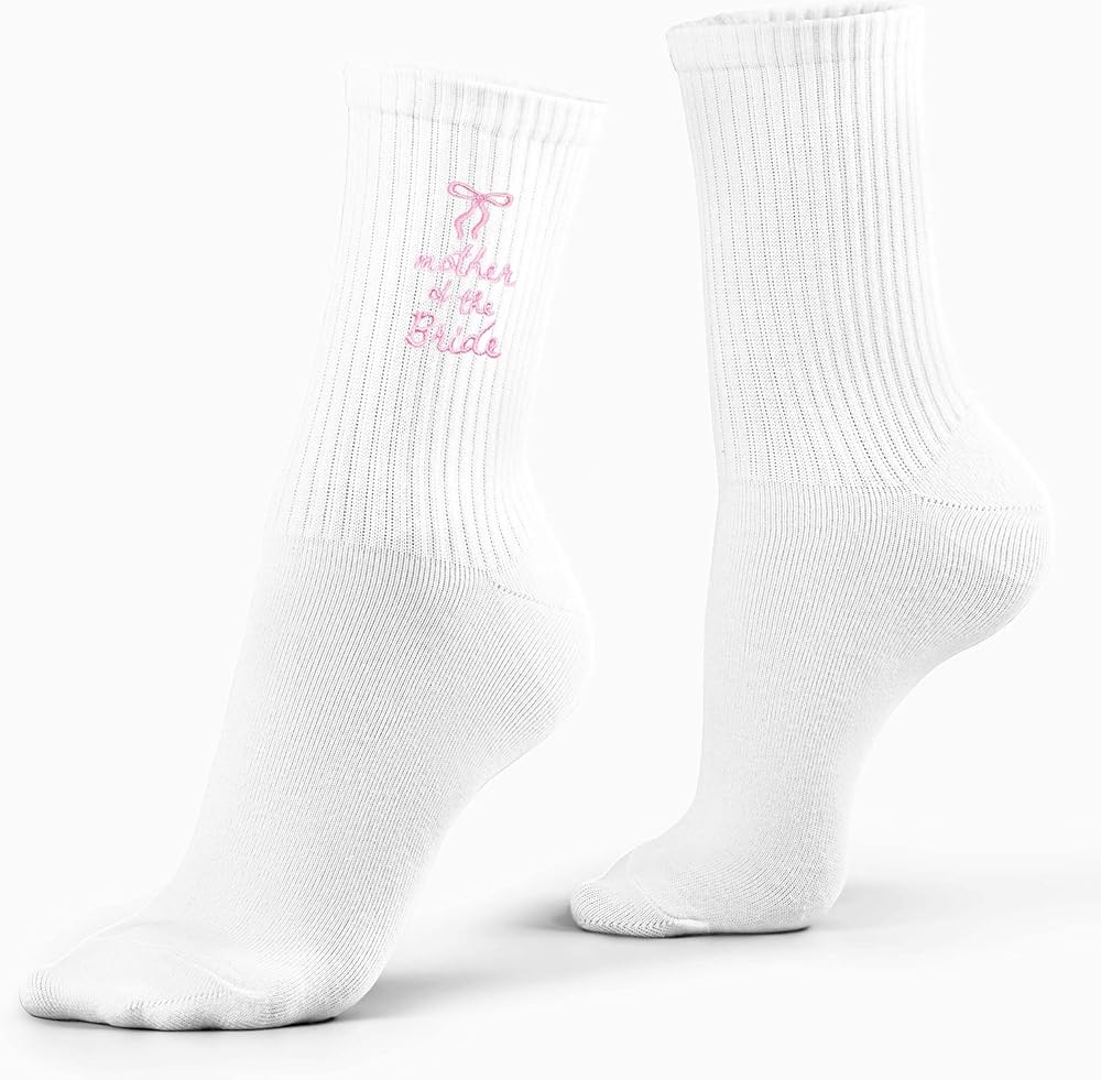 • Elegant Embroidery Design Detailed pink bow and “mother of the bride” lettering embroidered on crisp white socks, creating a classic and meaningful accessory