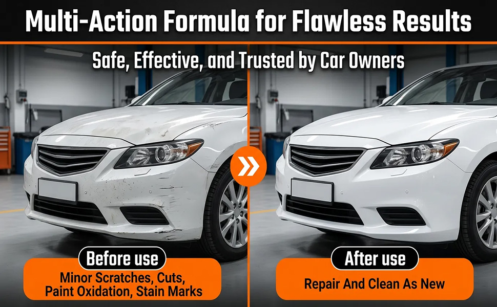 لمعان يدوم طويلاً وطلاء واقٍ: لا تدع الخدوش والدوامات تظهر مرة أخرى! يوفر هذا الإصلاح الاحترافي لخدوش السيارة لمسة نهائية شديدة اللمعان ويشكل حاجزًا متينًا ومقاومًا للماء وواقيًا للأشعة فوق البنفسجية. إنه يحمي من التآكل اليومي وغسيل السيارات وحطام الطريق، مما يحافظ على مظهر طلاء سيارتك جديدًا ومحميًا لعدة أشهر