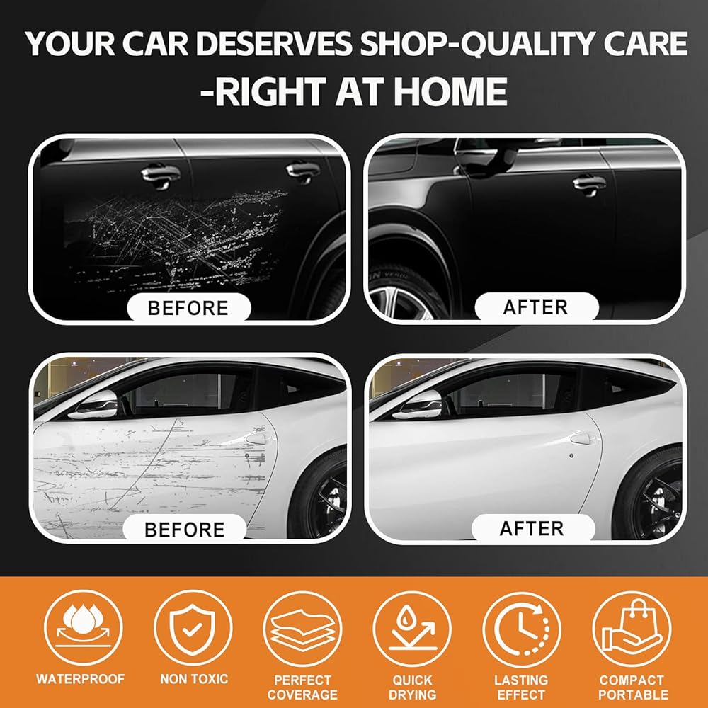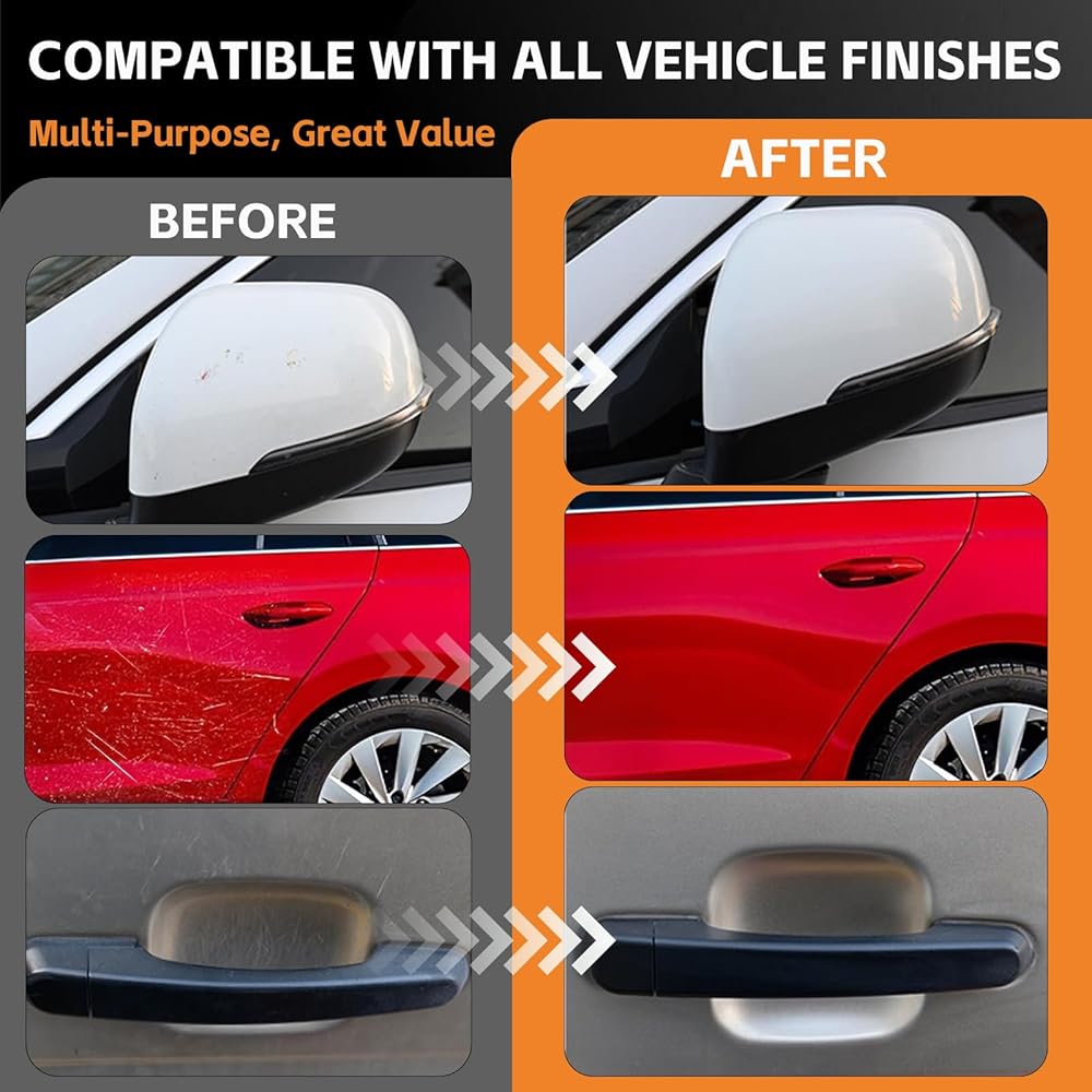 مزيل الخدوش التلقائي العالمي: مناسب لجميع أنواع وألوان الطلاء، بما في ذلك التشطيبات القياسية والمعدنية. فهو يعمل على إصلاح رقائق الطلاء البسيطة وعلامات وقوف السيارات وعلامات أغصان الأشجار والعيوب اليومية، مما يعيد سيارتك إلى مظهر ناعم كالجديد. مثالي للمسات النهائية السريعة والخدوش العميقة على المصدات والأغطية وحواف الأبواب ومعظم الأجزاء الخارجية